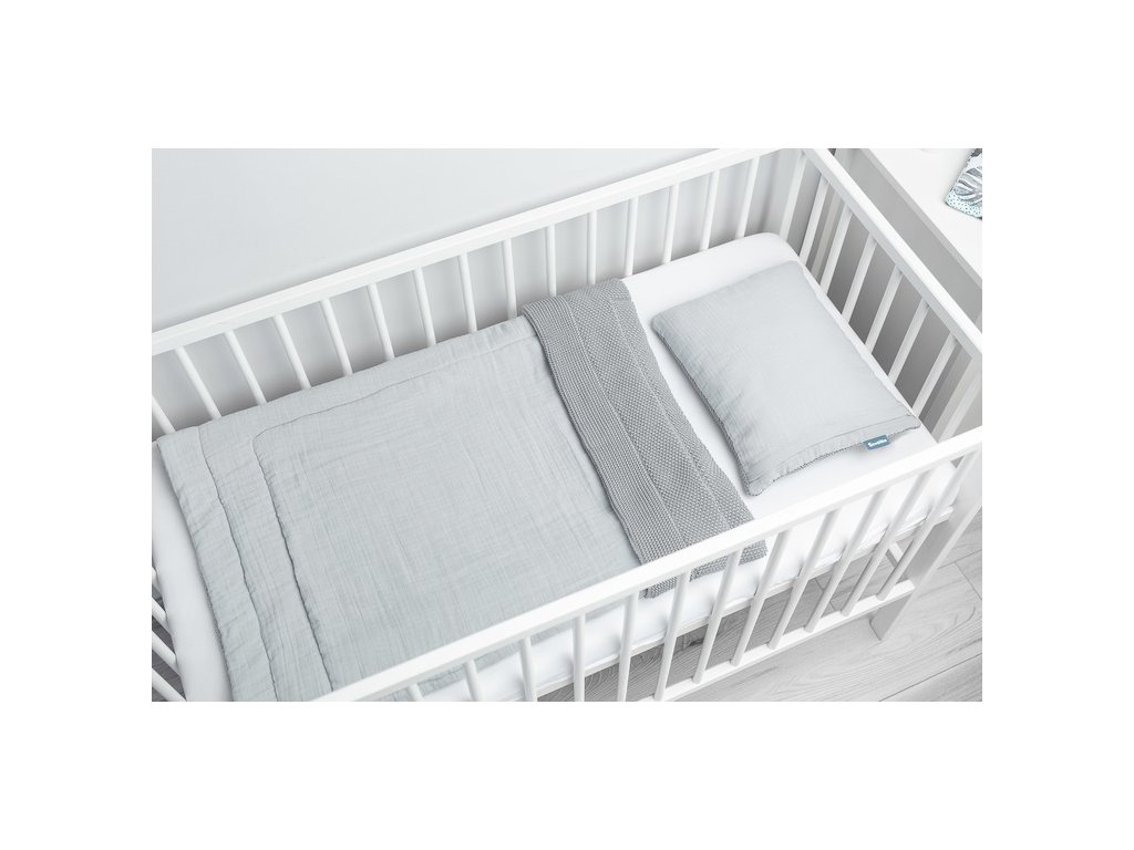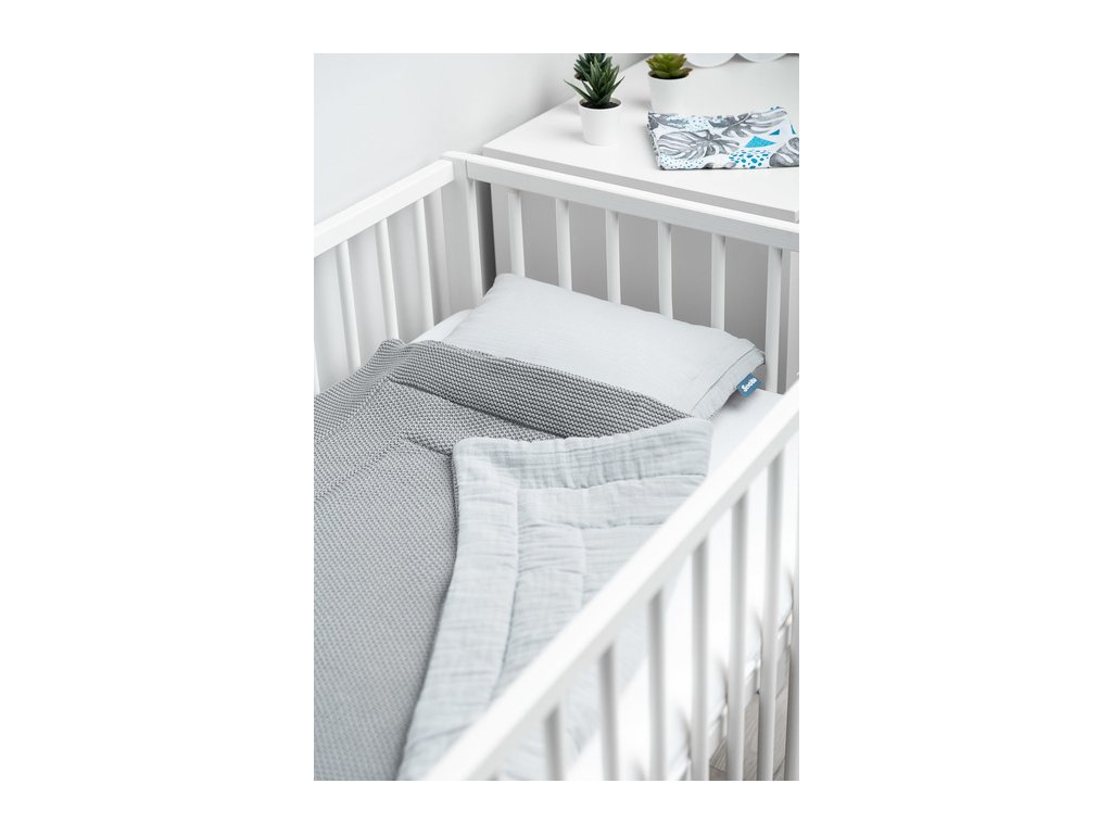 Komplet do dětské postýlky je elegantním spojením vysoce kvalitního mušelínu z jedné strany a jemné pletené bavlněné příze z druhé strany. Díky této kombinaci vznikl nadčasový set, který spojuje styl, kvalitu i praktičnost. Souprava je vhodná jak pro teplé letní dny, tak i pro chladnější období. Obsahuje oboustranný plochý polštář a dečku s antialergickou výplní, která je šetrná k citlivé dětské pokožce. Rozměry jsou navrženy tak, aby se komplet skvěle hodil do postýlky, kolébky, gondoly nebo se stal oblíbenou dečkou do kočárku. Díky skandinávskému stylu se hodí do každého dětského pokojíčku. Použité materiály i výplň splňují přísné požadavky certifikace OEKO-TEX® Standard 100, která zaručuje bezpečnost a zdravotní nezávadnost. Hlavní vlastnosti: Komplet vhodný do postýlky i kočárku. Vyroben z kvalitního mušelínu a elegantní pletené bavlny. Pomáhá udržovat optimální teplotu a mikroklima u pokožky dítěte. Antialergická výplň vhodná i pro citlivé děti. Nadčasový skandinávský design. Vyrobeno v Polsku. Rozměry: Polštář: cca 30 × 40 cm. Dečka: cca 100 × 80 cm. Složení: Vnitřní vrstva: 100 % bavlna. Vnější vrstva: 100 % bavlna. Výplň: 100 % polyester. Údržba: Praní ručně při maximální teplotě 30 °C. Nepoužívat bělidla, prát v jemném pracím prostředku. Nečistit chemicky. Žehlení při maximální teplotě 110 °C.Doplňkové parametry