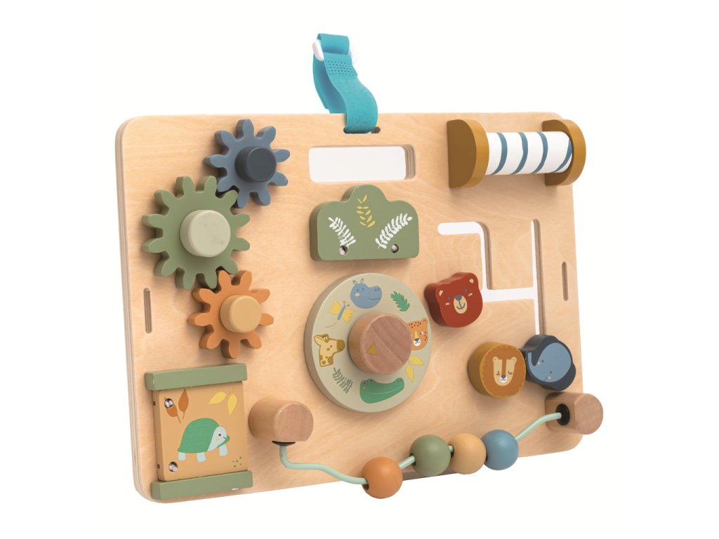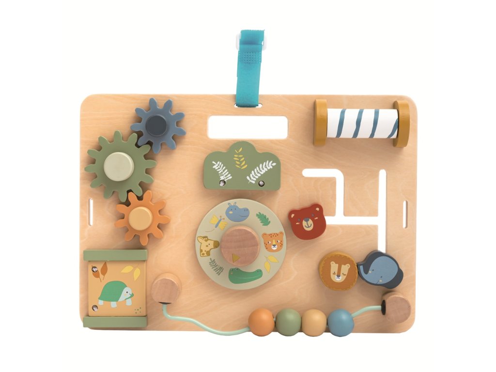 Tato hrací deska v pastelových barvách s roztomilými zvířátky přináší spoustu zábavy, díky které bude moci Vaše dítě rozvíjet zručnost, zvídavost a jemnou motoriku. Různé aktivity jako je korálkový labyrint, ozubená kolečka, otáčecí a posuvné destičky s obrázky zvířátek a další dávají dítěti možnost procvičovat otáčení, otevírání či zavírání a připravit se tak na úkony každodenního života. Jemné barvy, roztomilé obrázky a spousta aktivit stimulují smyslové vnímaní dětí. Díky praktickému výřezu lze desku jednoduše přenášet. Látkový popruh slouží k zavěšení. Hlavní vlastnosti: s výřezem pro snadné přenášenípodporuje jemnou motoriku a koordinaci ruka-okopodněcuje představivostsenzorická stimulacevhodné od 18 měsícůDoplňkové parametry
