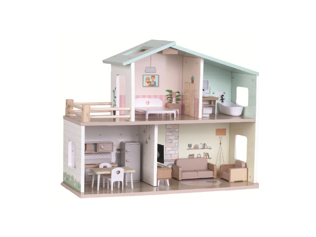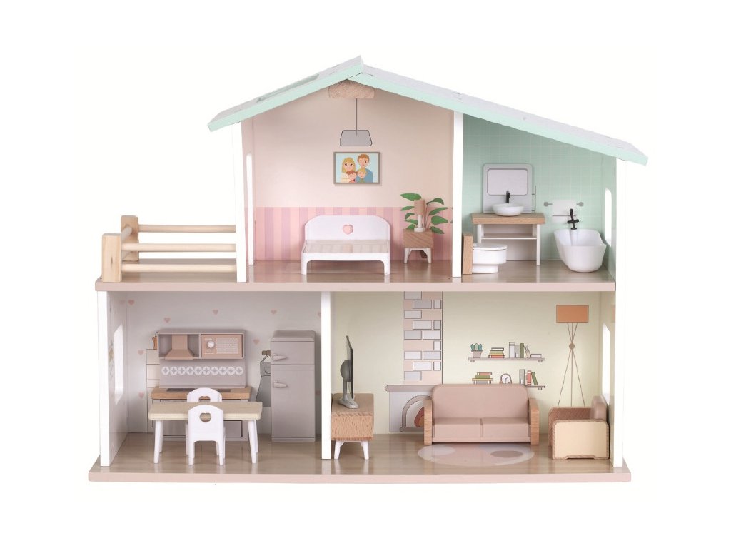 Vítejte v domečku, ve kterém vládne pohoda! Domeček ve venkovském stylu je plně vybaven nábytkem i doplňky. Najdete v něm kuchyni, útulný obývací pokoj, stylovou koupelnu s vanou, ložnici a terasu pro chvíle pohody. Děti při hře rozvíjejí fantazii, sociální dovednosti i smysl pro detail. A hlavně se výborně baví! Hravý design, jemné barvy spolu s kvalitním provedením dělají z této hračky krásný doplněk každého pokojíčku nebo herny. Domeček je dodáván v rozloženém stavu a vyžaduje montáž. Návod k sestavení je součástí balení. Hlavní vlastnosti: 16 dílůplně vybavený dřevěný domeček podporuje fantazii, tvořivost a hru na rolevede k představivé hřekvalitní zpracování a atraktivní designdodáváno v rozloženém stavu, nutná montážnávod k sestavení je součástí balenívhodné pro děti od 3 letDoplňkové parametry