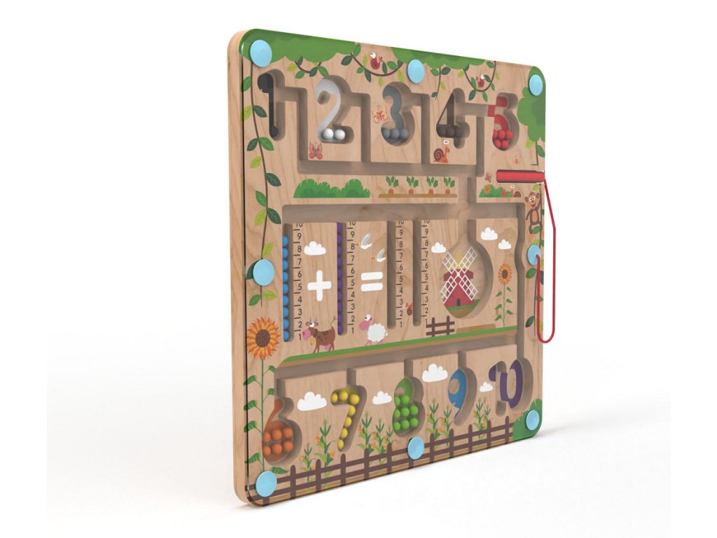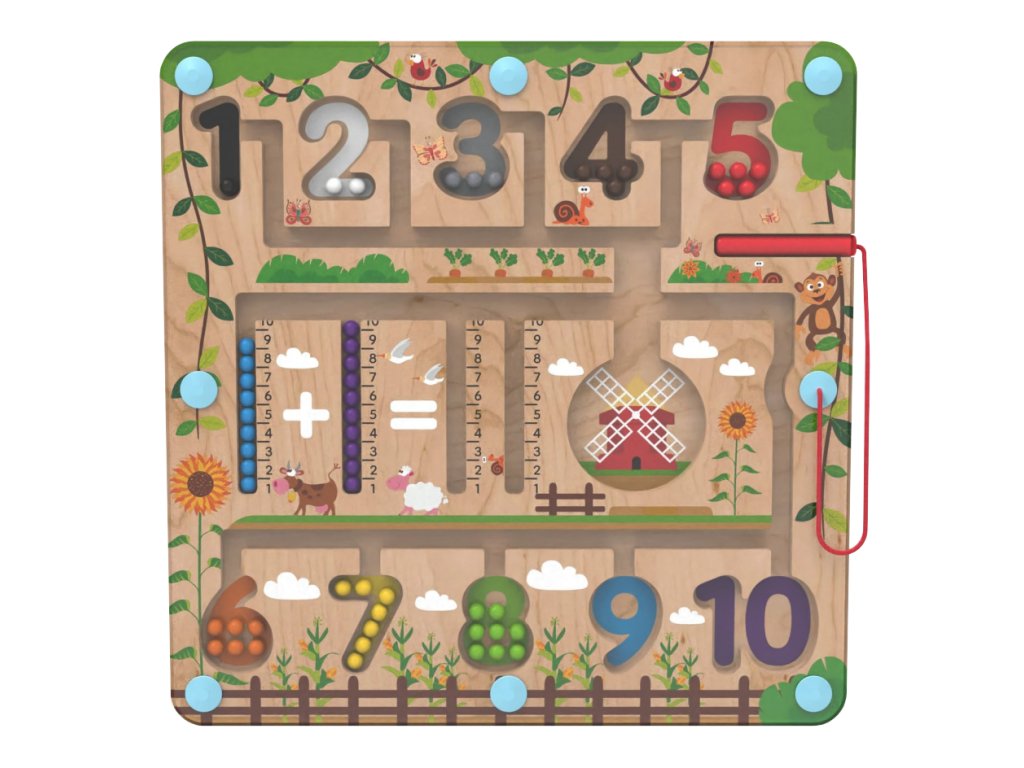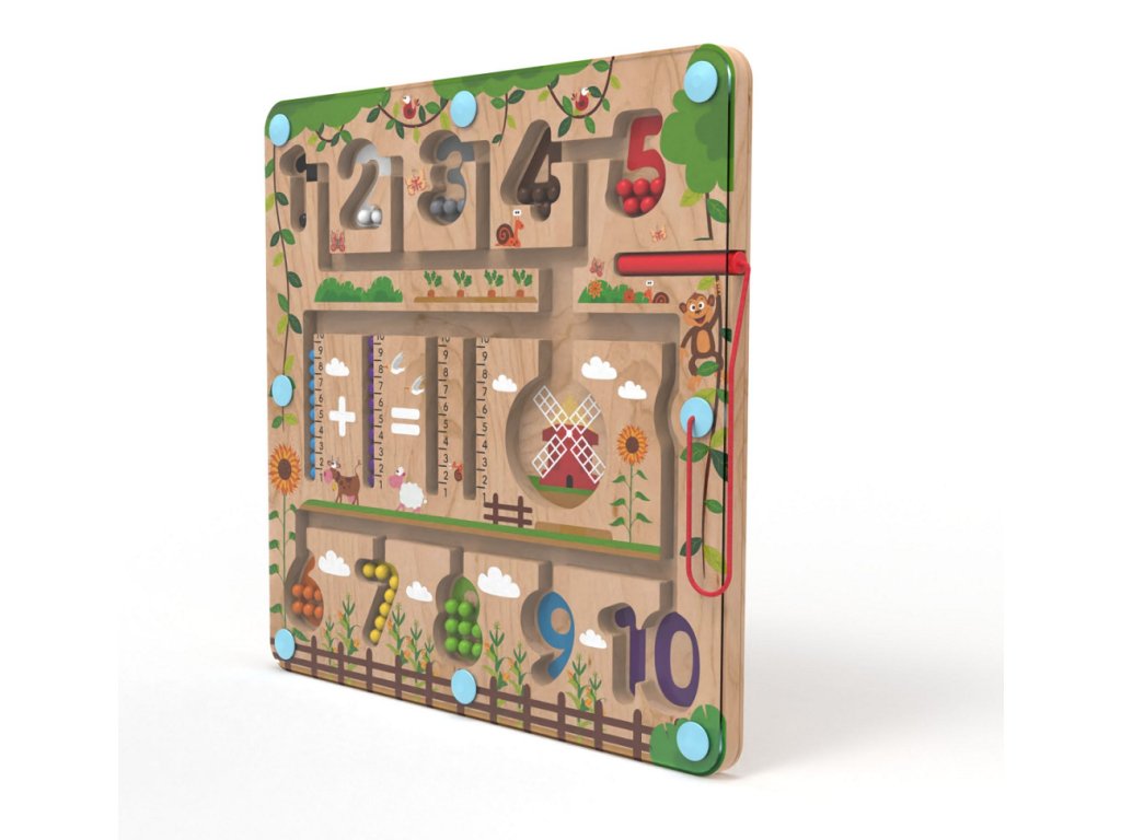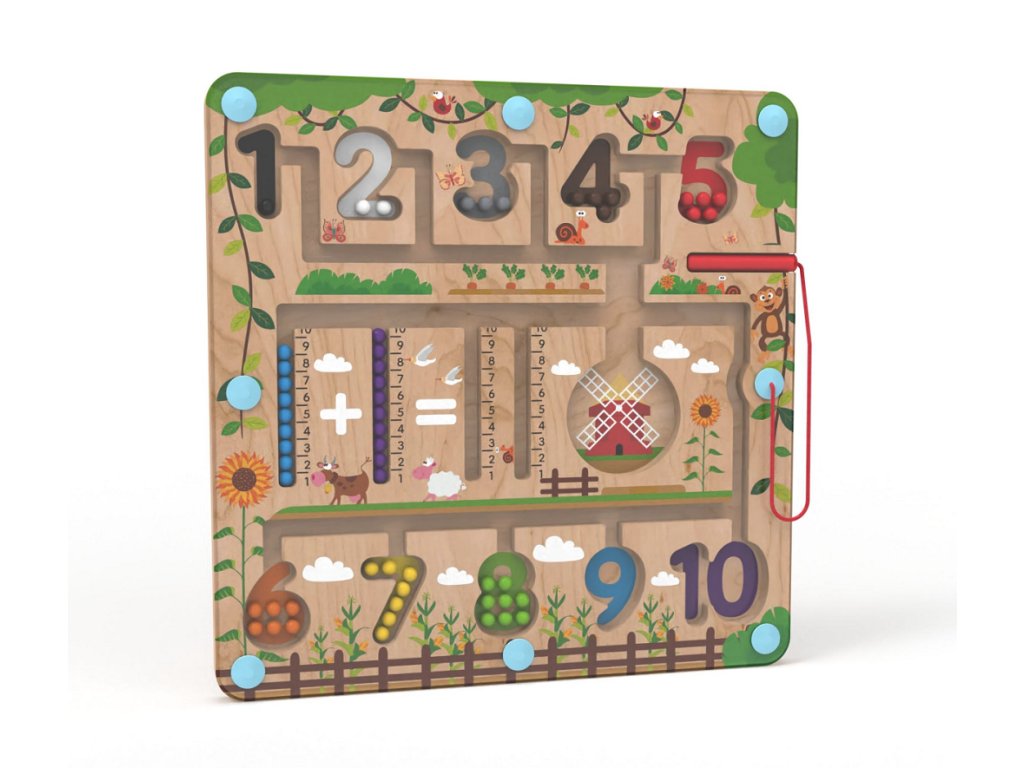 Vydejte se na cestu přírodou s barevnými kuličkami. Provedete úspěšně různobarevné kuličky všemi zákoutími? Umístíte všechny do mlýna? Vejdou se tam? Nebo pomocí čísel na metru vytvoříte a vypočítáte příklad? K vedení kuliček se při hře využívá magnetické ukazovátko, které prověří dětskou trpělivost a koordinaci rukou a zraku. Dokážete pak navrátit kuličky zpět na své místo podle barvy? Je počet kuliček stejný jako číslo, do kterého jste je umístili? Zábavná dřevěná hra, která pomáhá dětem rozvíjet jemnou motoriku, orientovat se v prostoru a rozšiřovat slovní zásobu pojmenováváním barev a předmětů ve městě. Děti se také učí počítání zábavnou formou. Dřevěná základna v designu přírody je kryta odolnou průhlednou plastovou deskou, hračka je díky tomu bezpečná. Hlavní vlastnosti: úvod do světa počtůrozvíjí motorické dovednosti dětí zábavné i bezpečné díky magnetickému principuDoplňkové parametry