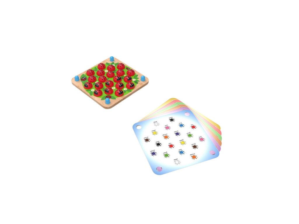 Pexeso, které učí i baví!Tato netradiční vzdělávací hra zaujme děti i dospělé hravou formou, která rozvíjí paměť, soustředění a pozorovací schopnosti. Na rozdíl od klasického pexesa děti neobracejí papírové kartičky, ale používají dřevěné berušky, které lépe padnou do malých dětských ručiček.Stačí mezi dvě dřevěné desky vložit jednu ze šesti tematických předloh, zakrýt obrázky beruškami a zábavná hra může začít. Děti si při ní procvičí nejen paměť, ale také jemnou motoriku, logické myšlení a rozšíří si slovní zásobu. Hra je ideální pro samostatné hraní i společné chvíle s rodinou. Hra obsahuje 6 tematických karet. Na jedné kartě je ovoce, na druhé geometrické tvary, na třetí domácí zvířata, na čtvrté zvířátka ze zoo, pátá karta je s dopravními prostředky a poslední, šestá karta, má na sobě barevné skvrny s anglickými názvy barev. Všechny karty jsou oboustranné. Pravidla hry: Vyberte si jednu z hracích karet. Zasuňte kartu mezi 2 dřevěné desky. Umístěte na obrázky přiložené berušky. Hra pokračuje jako klasické pexeso – hráč v každém kole obrací dvě berušky a hledá shodné dvojice. Vyhrává ten, kdo najde nejvíce dvojic. Hlavní vlastnosti: 2dílná dřevěná hrací deska, 6 tematických hracích karet, 20 dřevěných berušekrozvoj koordinace ruka–okopodpora manuálních dovedností a obratnostitrénink logického myšlenísenzorická stimulace rozvoj kognitivních schopností a koncentracerobustní a odolné provedení z kvalitního dřevaDoplňkové parametry