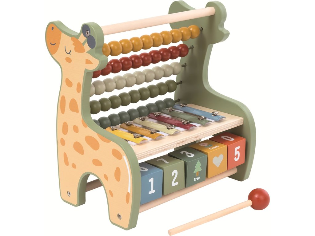 Počítadlo a xylofon jsou propojené hračky, které nabízejí dětem možnost objevovat rytmus a zvuky, rozvíjet motorické dovednosti a seznámit se s čísly a počítáním. Barevné počítadlo s motivem usměvavé žirafy zaujme každé dítě. Má 7 řad barevných korálků pro první počítání a řadu otočných kostek s čísly a obrázky, které podporují rozpoznávání tvarů, čísel a barev. Na xylofonu s barevnými klávesami si děti mohou pomocí přiložené paličky přehrát své první melodie. Ideální hračka pro rozvoj smyslů, motorických dovedností i hudebního cítění. Nejedná se o hudební nástroj, ale pouze o hračku. Hlavní vlastnosti: 2 dílypočítadlo a xylofon v jednomúvod do světa zvuků a rytmuseznámení s čísly a počítáním rozvíjí smyslové vnímání a motorické dovednostivhodné pro děti od 2 letDoplňkové parametry
