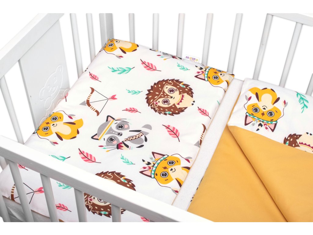 3-dílná sada Mantinel s povlečením-Ježek a Liška, bílá s potiskem/hořčicová