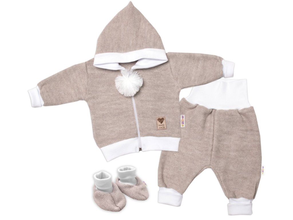 3-dílná souprava Hand made, pletený kabátek, kalhoty a botičky, béžová
