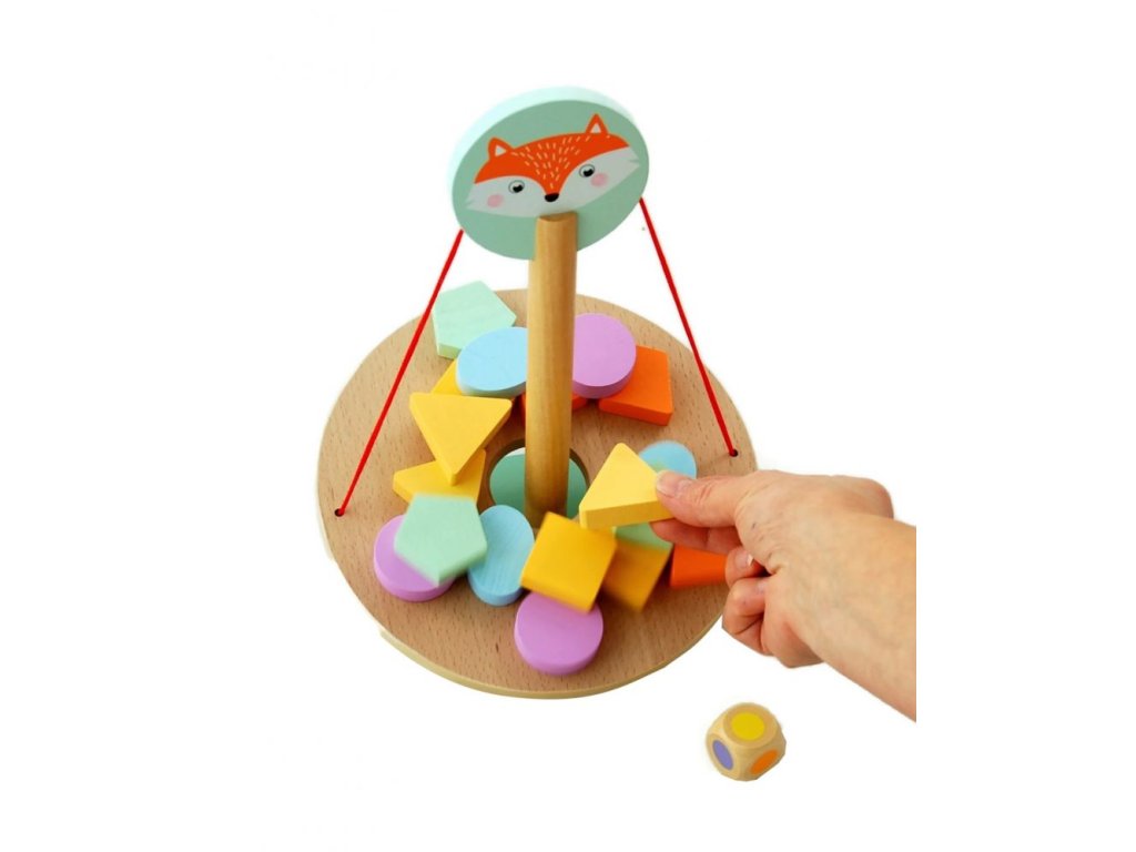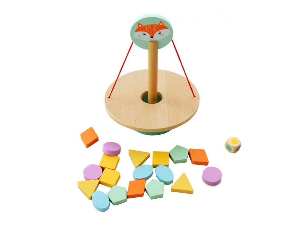 Balanční hra s tvary - liška. Tato hra je skvělá k procvičování malých prstíků. Starší děti i dospělí si také rádi vyzkoušejí tuto zdánlivě snadnou hru. Hračka je vyrobena tak, že základna, na kterou se bloky umístí, byla namontována na provázku, takže je pohyblivá. Co odlišuje tuto hru od ostatních: Je zcela odlišná - inovativní způsob vytváření vyrovnávací základny, díky které není hra vůbec snadná - barevné kostky, které se liší jak barvou, tak tvarem, - krásný design v pastelových barvách a roztomilým obrázkem lišky. Hra obsahuje:balancující základna,18 barevných kostek, házení kostkami. Rozměry:20 x 28cm. Věk: 3+.Doplňkové parametry