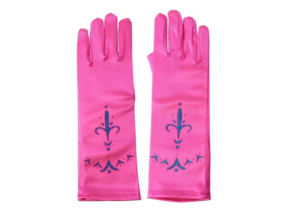Součástí balení jsou také růžové saténové rukavice s jemným modrým vzorem, který připomíná motivy z království Arendelle. Nechybí ani sada šperků – náhrdelník, náramek, prstýnek a náušnice – všechny sladěné do růžova s lesklými srdcovými kamínky.