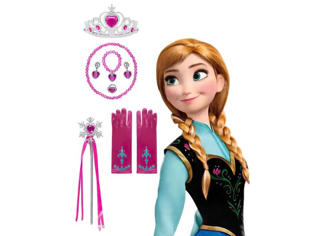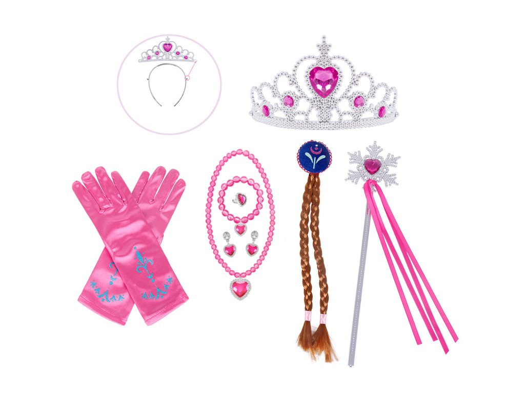 Obsahuje devět kouzelných kousků, které dohromady tvoří dokonalý pohádkový outfit. Dominantou sady je krásná třpytivá korunka s růžovými kamínky a čelenka s dlouhým hnědým copánkem, typickým pro Annu.