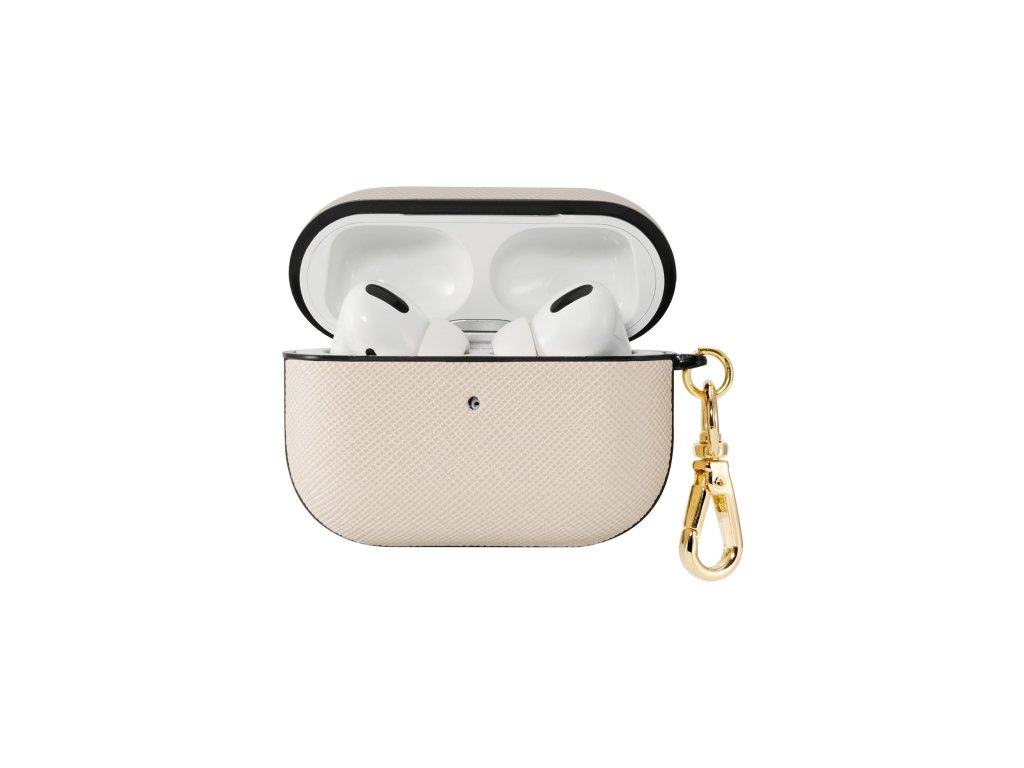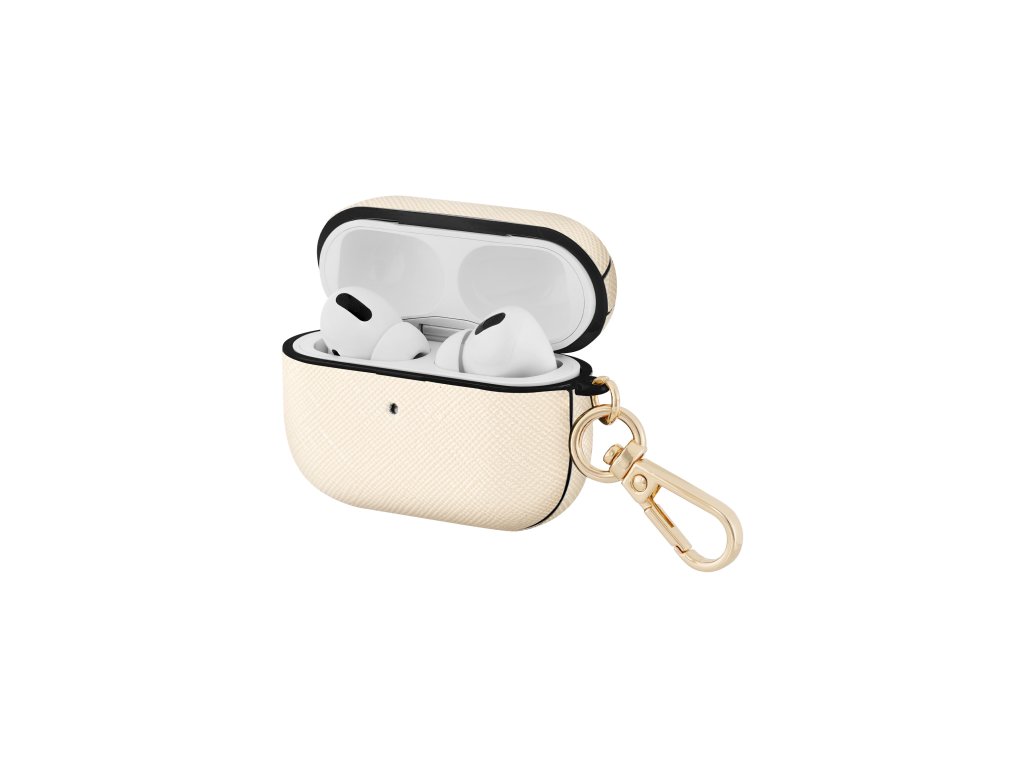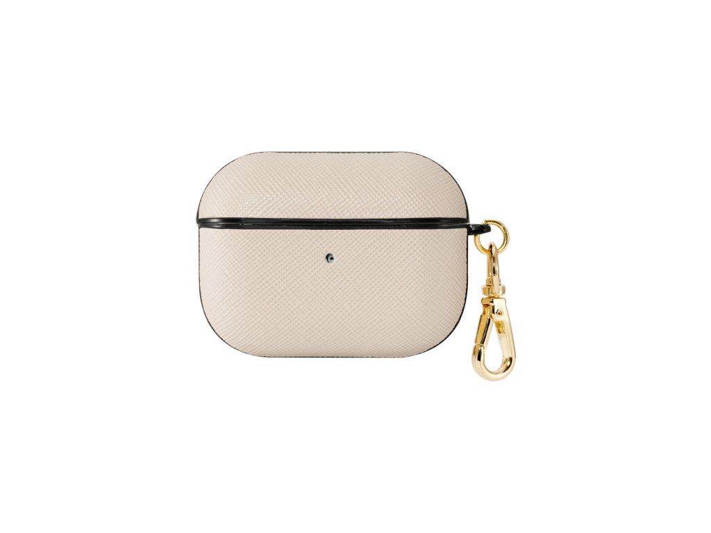 Toto exkluzivní pouzdro je vyrobeno z veganské kůže s ikonickou texturou saffiano. Provedení v béžové barvě odstínu slonoviny s černými a zlatými detaily z něj dělá elegantní doplněk s nadčasovým designem. S praktickou karabinkou můžete snadno připevnit pouzdro na vaši tašku, klíče nebo kapsu, což zajišťuje pohodlný a bezpečný transport vašich sluchátek kamkoliv jdete.