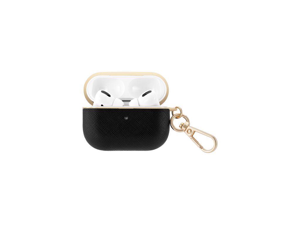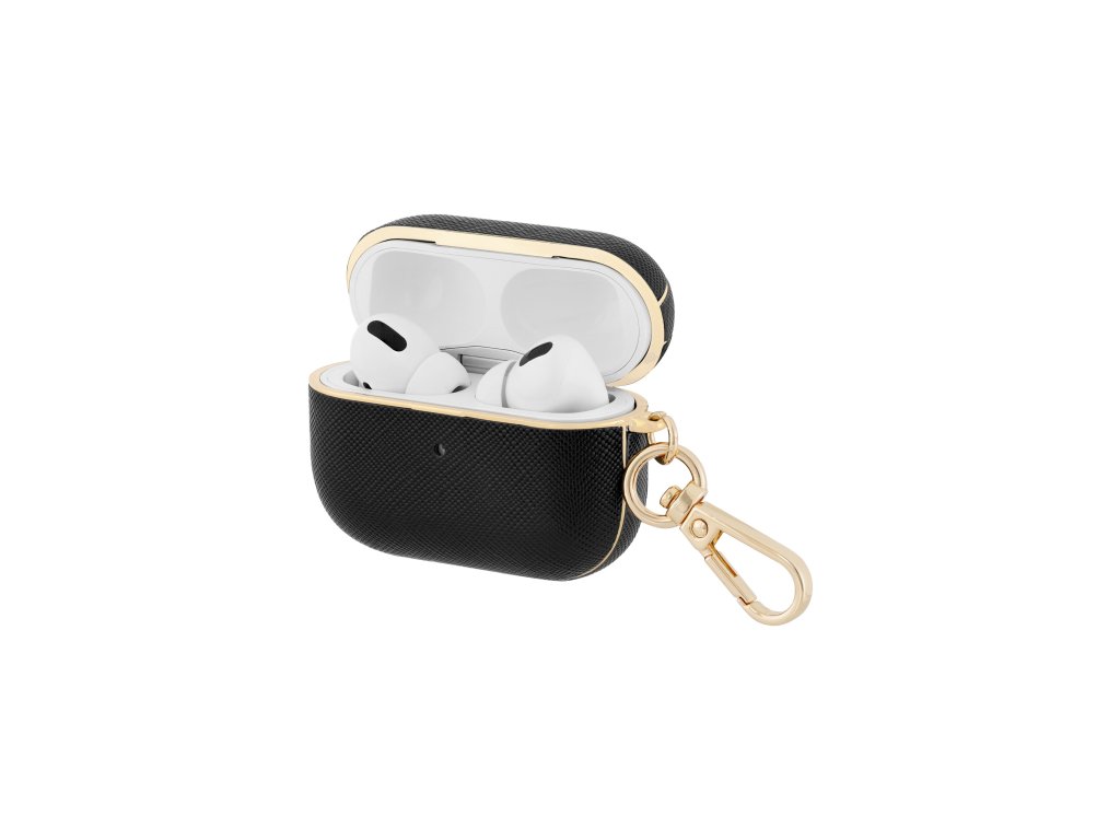 Toto exkluzivní pouzdro je vyrobeno z veganské kůže s ikonickou texturou saffiano. Provedení v černé barvě se zlatými detaily z něj dělá elegantní doplněk s nadčasovým designem. S praktickou karabinkou můžete snadno připevnit pouzdro na vaši tašku, klíče nebo kapsu, což zajišťuje pohodlný a bezpečný transport vašich sluchátek kamkoliv jdete.