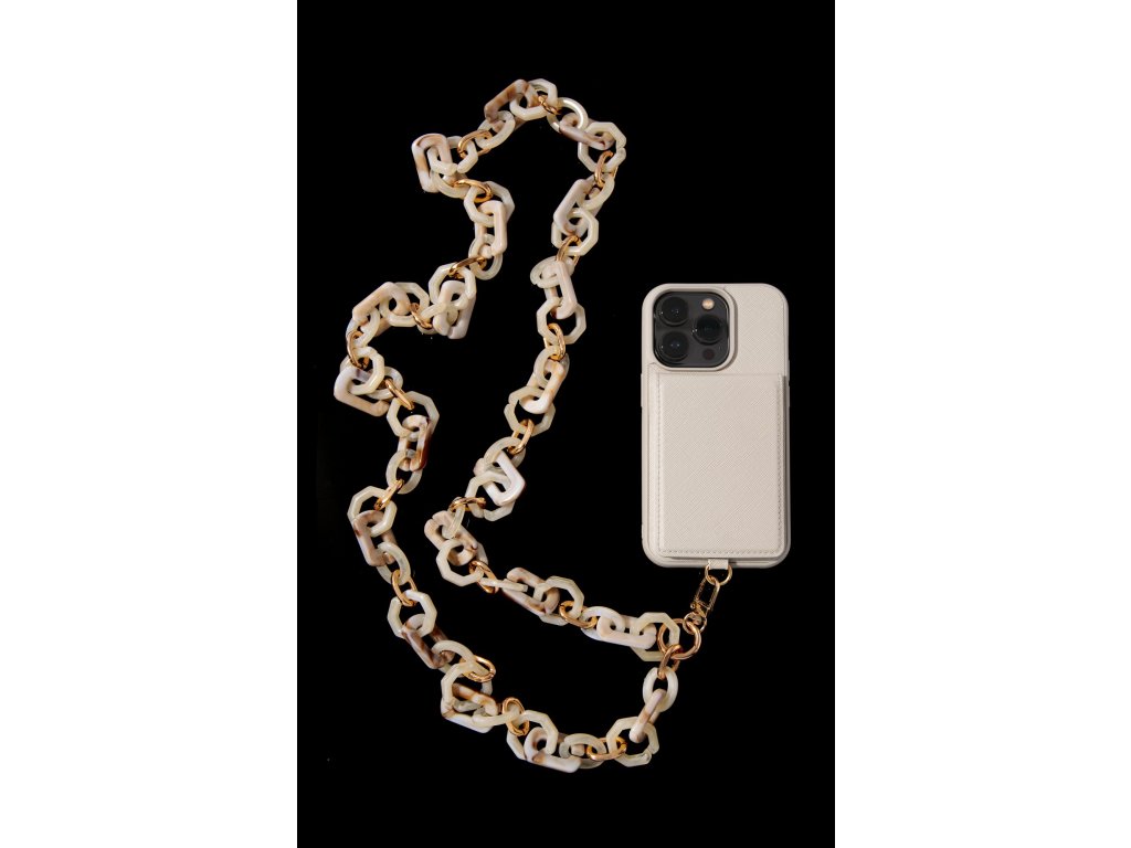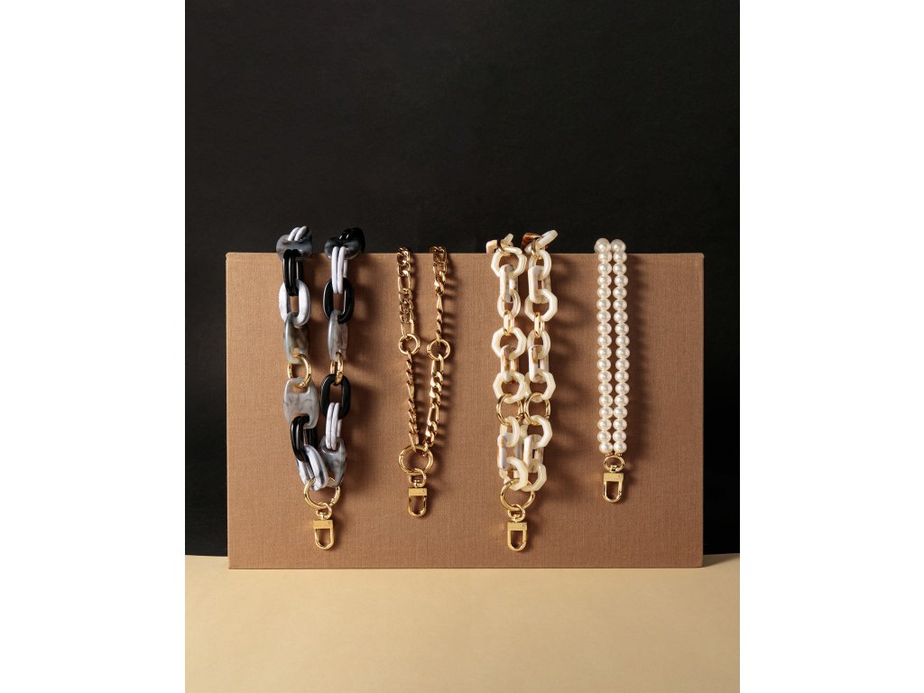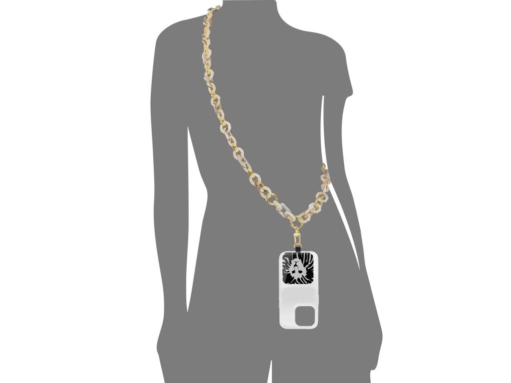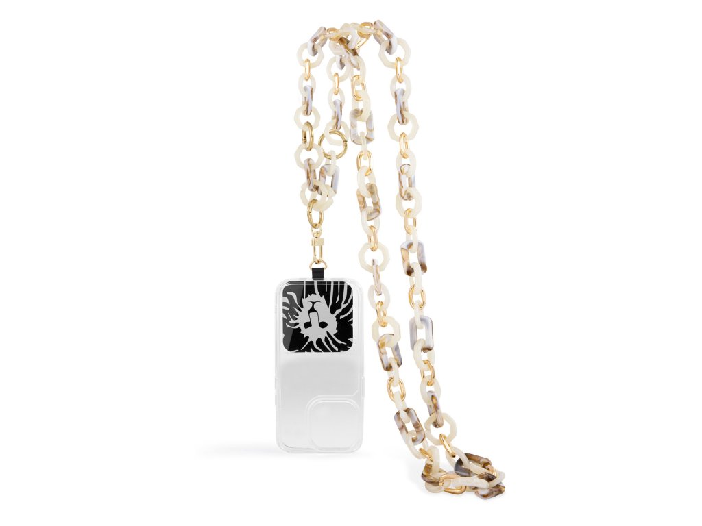 Řetízek, díky kterému budete mít svůj telefon stále při ruce, je vyroben z kovových oček a oček z odolného tvrzeného plastu. Má nastavitelnou délku a k telefonu se připojuje pomocí pozlacené kovové karabinky s logem značky. Řetízek je super univerzálním doplňkem, který vynosíte na cesty, do města nebo na párty s přáteli.