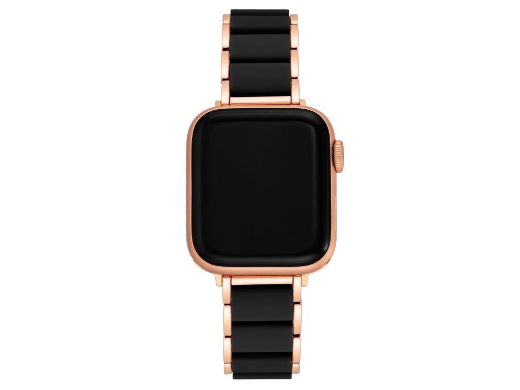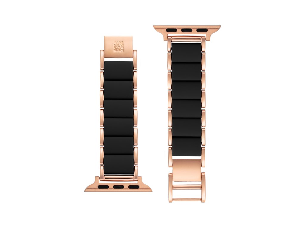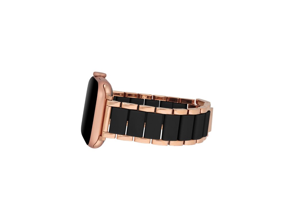Řemínek je složen z ocelových prvků růžovozlaté barvy po obvodu a středových článků z černého silikonu. Tato barevná kontrastní kombinace působí velmi stylovým dojmem. Díky svému materiálu se náramek velmi příjemně nosí přes den v práci i večer na sport či večírek.