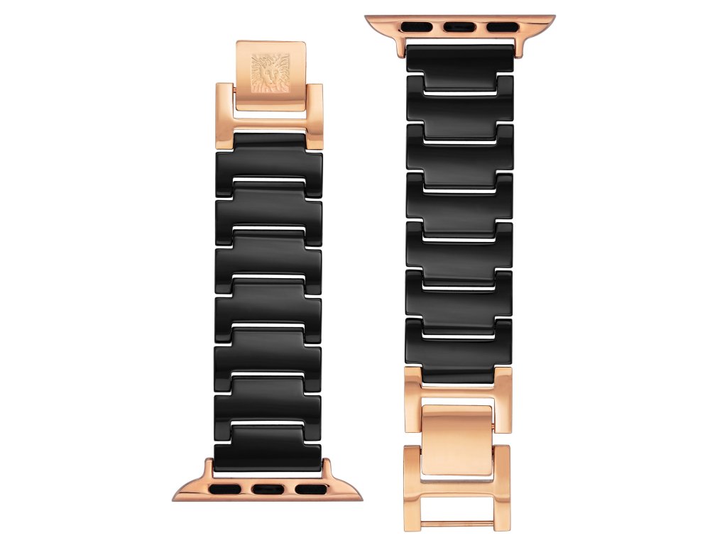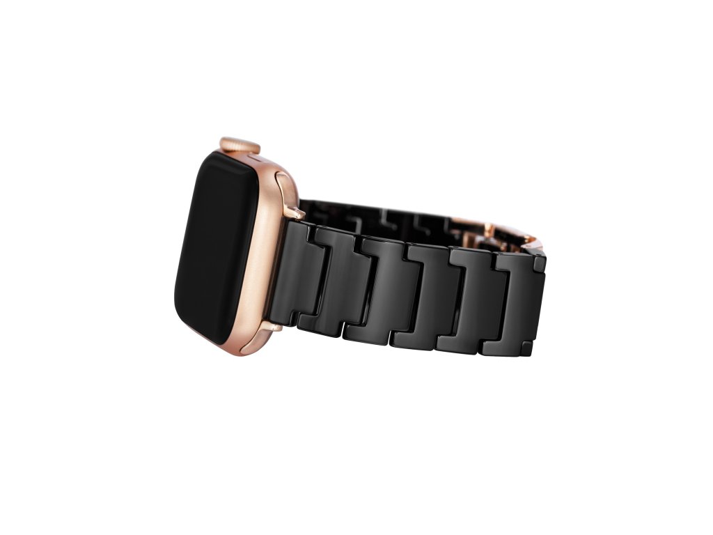 Pořiďte si tento stylový keramický řemínek pro Apple Watch hodinky v černé barvě, kterou doplňují kontrastní prvky z oceli v růžové barvě.