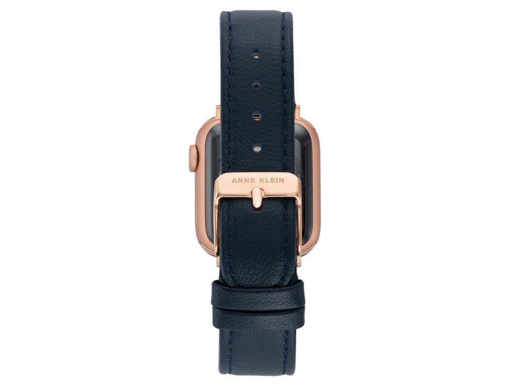 Řemínek je z kůže námořnické barvy a doplněn je detaily z nerezové oceli v růžové barvě.