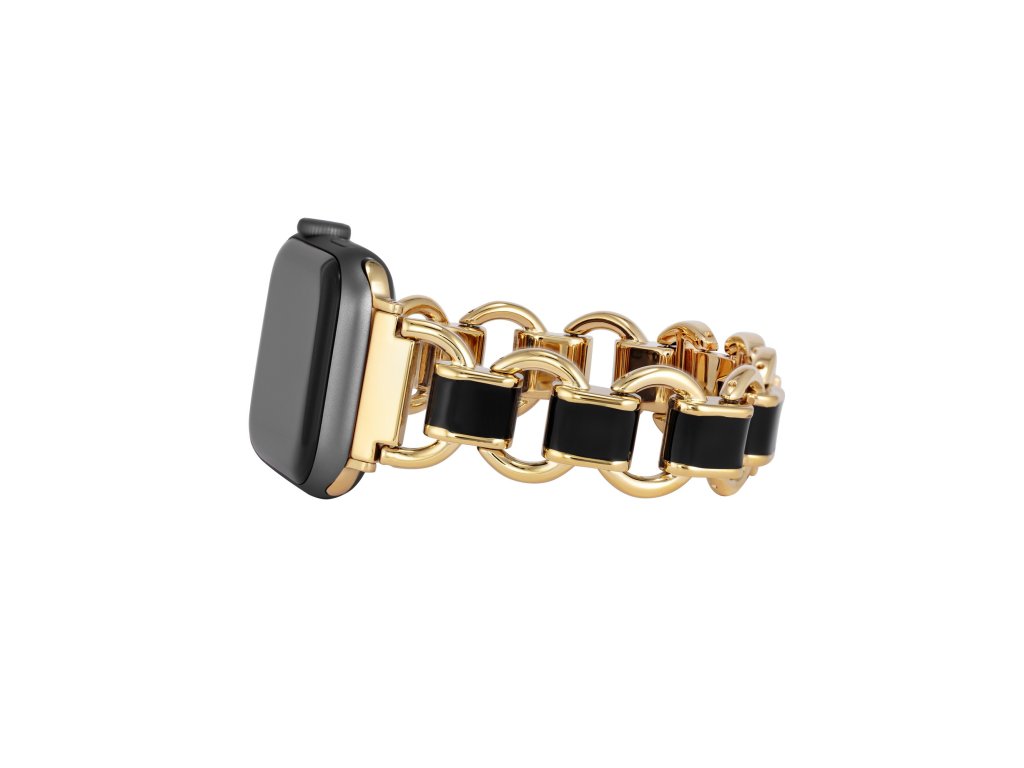 Zlatou barvu elegantního řemínku z kovu doplňují černé smaltované středové články.