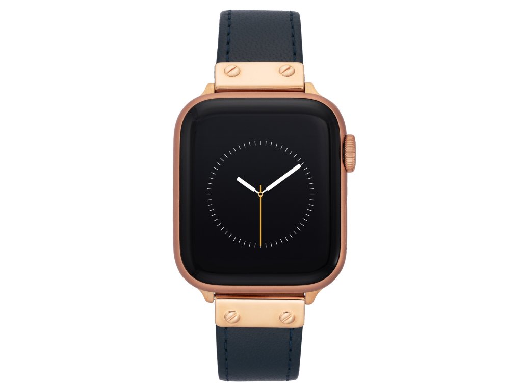 Řemínek je z kůže námořnické barvy a doplněn je detaily z nerezové oceli v růžové barvě.