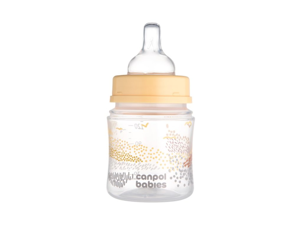 Antikoliková lahvička Easy start. Antikoliková lahvička EasyStart byla vytvořena s ohledem na spokojené bříško vašeho miminka. Speciální antikolikový ventil zabraňuje hromadění vzduchových bublin v jídle, což v kombinaci se správně zvolenou polohou krmení umožňuje účinně eliminovat břišní diskomfort vašeho miminka související s kolikou a plynatostí. Tvar savičky umožňuje optimální fungování rtů, tváří a jazyka a také správnou tvorbu vzoru sání. Dudlík je vyroben z měkkého a hypoalergenního silikonu, díky kterému je velmi odolný, nedeformuje se, nevysychá a nebarví. Objem: 120 ml. Bez bisfenolu A. Doporučený věk: 0 m+.Doplňkové parametry