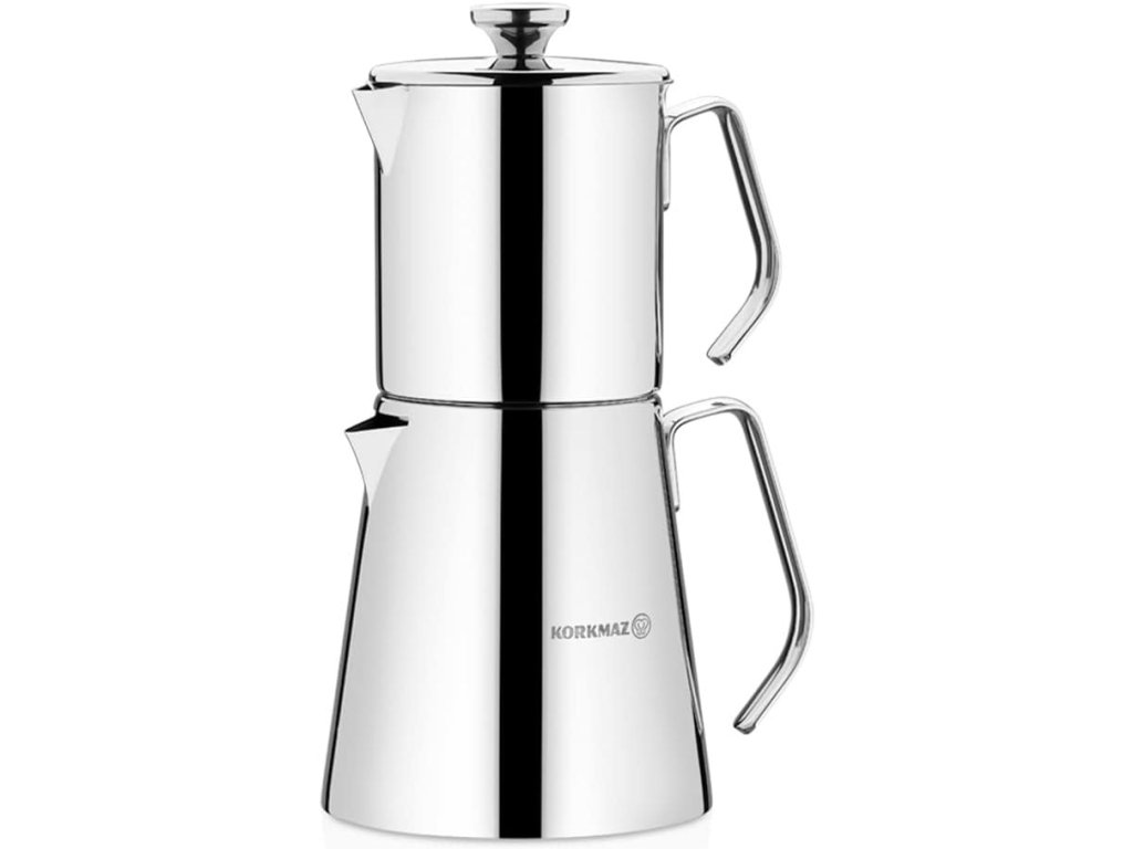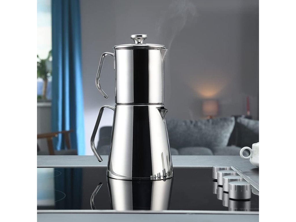 - Moderní sada dvojitých tureckých konvic Aqua s kovovými rukojeťmi je vyrobena z vysoce kvalitní exkluzivní nerezové oceli 18/10 C-Ni a má dlouhou životnost. Při čištění dle pokynů nerezaví ani nevybledne.