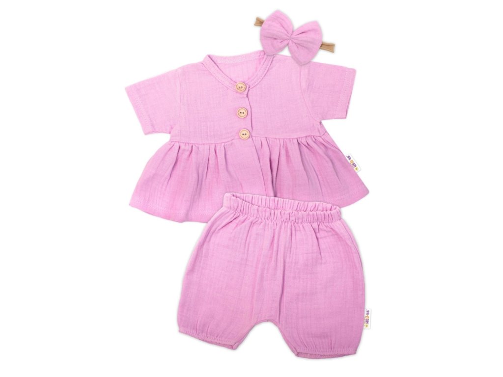 Baby Nellys 3-dílná mušelínová soupravička, tunika/halenka, kraťasky, čelenka, růžová