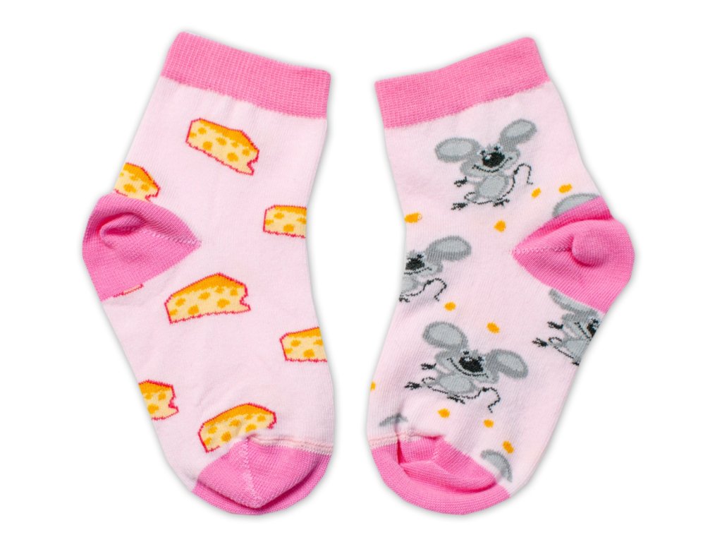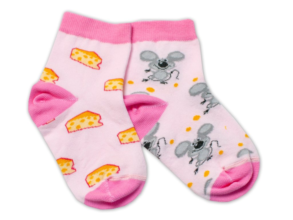Baby Nellys Bavlněné veselé ponožky Myška a sýr - světle růžová