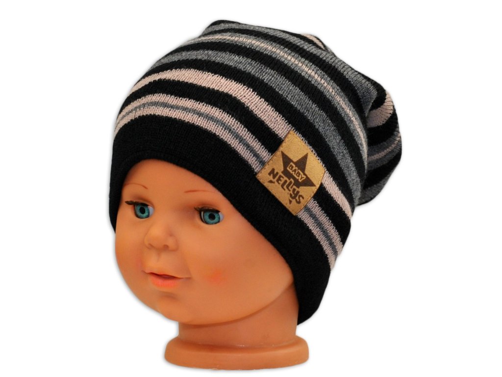 BABY NELLYS Jarní/podzimní proužkovaná čepice -černá/béžová/grafit