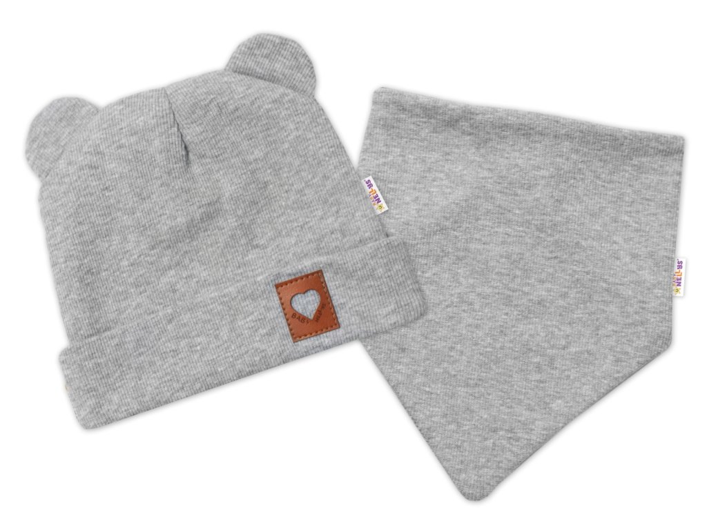 Baby Nellys Žebrovaná dvouvrstvá čepice s oušky + šátek TEDDY - šedý melír
