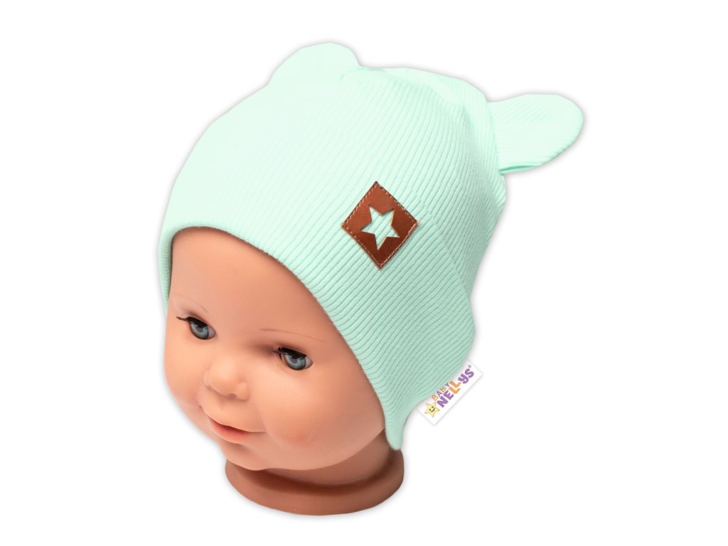 Baby Nellys Žebrovaná dvouvrstvá čepice s oušky TEDDY - mátová