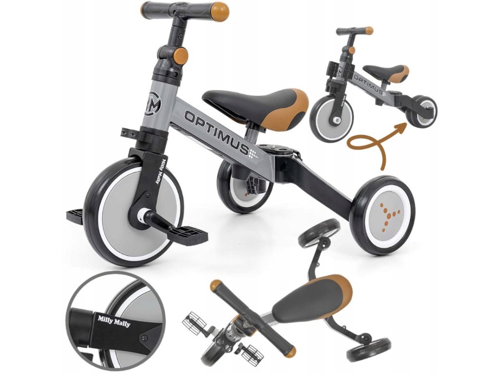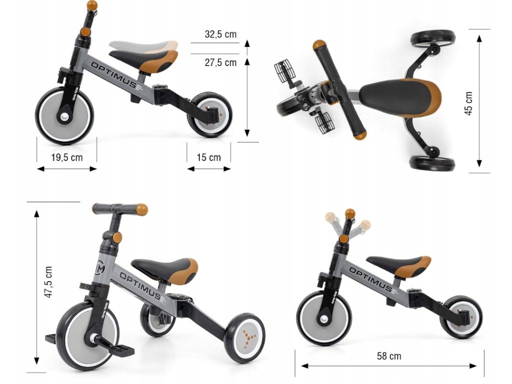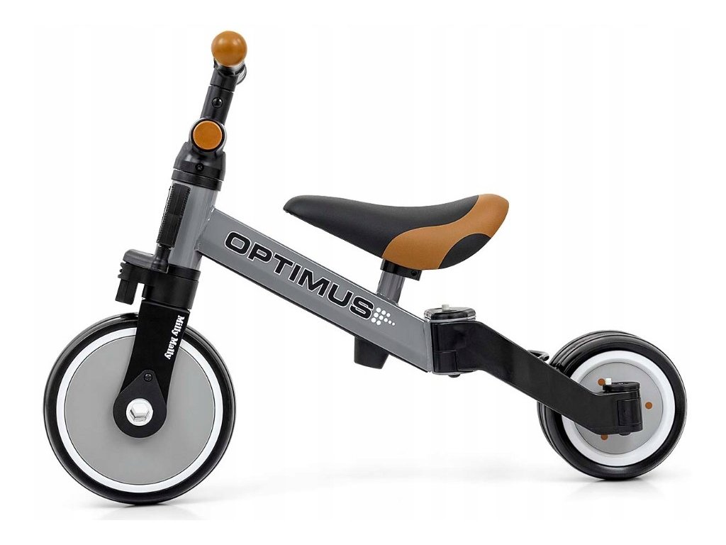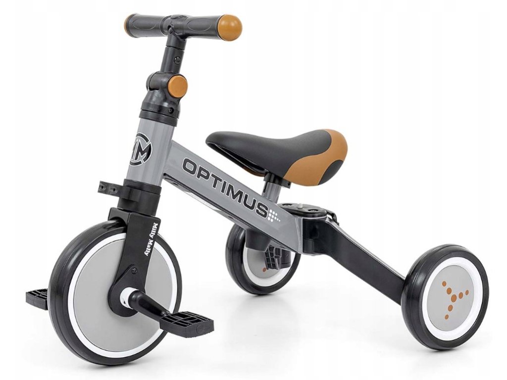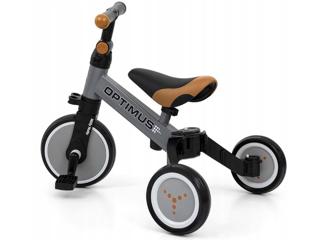 Balanční tříkolka, odrážedlo. Optimus je navržen tak, aby byl jednou z nejlepších voleb pro první vozidlo vašeho dítěte. Díky stabilní tříkolové konstrukci poskytuje dítěti patřičnou míru bezpečí a usnadňuje získávání nových dovedností. Když dítě zvládne základy jízdy, můžeme přidat pedály nebo z něj udělat klasické balanční kolo. Kolo bylo vyrobeno z vysoce kvalitních materiálů. Pěnová kola usnadňují jízdu při zachování dostatečného pohodlí. Nastavitelná výška sedla umožňuje přizpůsobit kolo výšce dítěte. Optimus ve 3 krocích: - tříkolka bez pedálů - vhodná pro první zkušenost dítěte. - balanční kolo - po složení zadních kol do jednoho získáme klasické balanční kolo. - tříkolka s pedály v předním kole. Vlastnosti produktu: - pohodlné tvarované sedlo, - nastavení výšky sedla, - pěnové pneumatiky, - ocelový rám, - pedály u předního kola, s možností uchycení na madlo umístěné ve sloupku řízení nastavení úhlu řízení, - omezovač otáčení, - sklopná zadní vidlice, - věkové rozmezí 12 m+. Maximální hmotnost dítěte 25 kg. Rozměry: výška 47,5 cm, délka 58 cm, šířka 45 cm.Doplňkové parametry