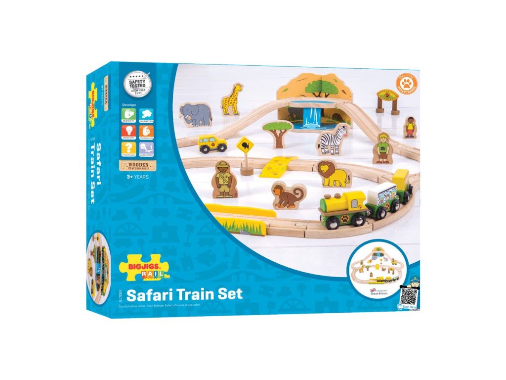 Všichni na palubu! Safari vlak odjíždí na Bigjigs Safari dobrodružství. Jaké divoké zvíře bude na cestě? Vtipná opice nebo obří žirafa? Možná dokonce uslyšíte hlasitého lva! Tato 38 dílná sada obsahuje vysoce kvalitní dřevěné koleje, lokomotivu se dvěma vagónky, divoká zvířata včetně slona, zebry a opice, nápisy, stromy a další! Hra podporuje kreativní myšlení, představivost a koordinaci, rozvíjí jemné motorické dovednosti a koordinaci rukou a očí. Magnetické spojky zajišťují kompatibilitu s lokomotivami a vozíky v řadě Bigjigs Rail. K rozšíření této sady je k dispozici další příslušenství. Hlavní vlastnosti: vláčkodráhy a jejich příslušenství značky Bigjigs Rail je možno kombinovat se všemi dalšími dřevěnými vláčkodráhami na trhuvyrobeno z kvalitních a zodpovědně získaných přírodních materiálůodpovídá současným evropským bezpečnostním normámpodporuje představivost, obratnost a koordinaciDoplňkové parametry