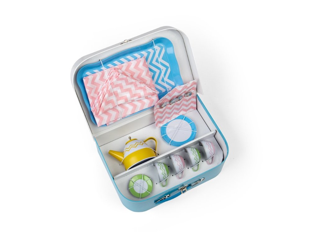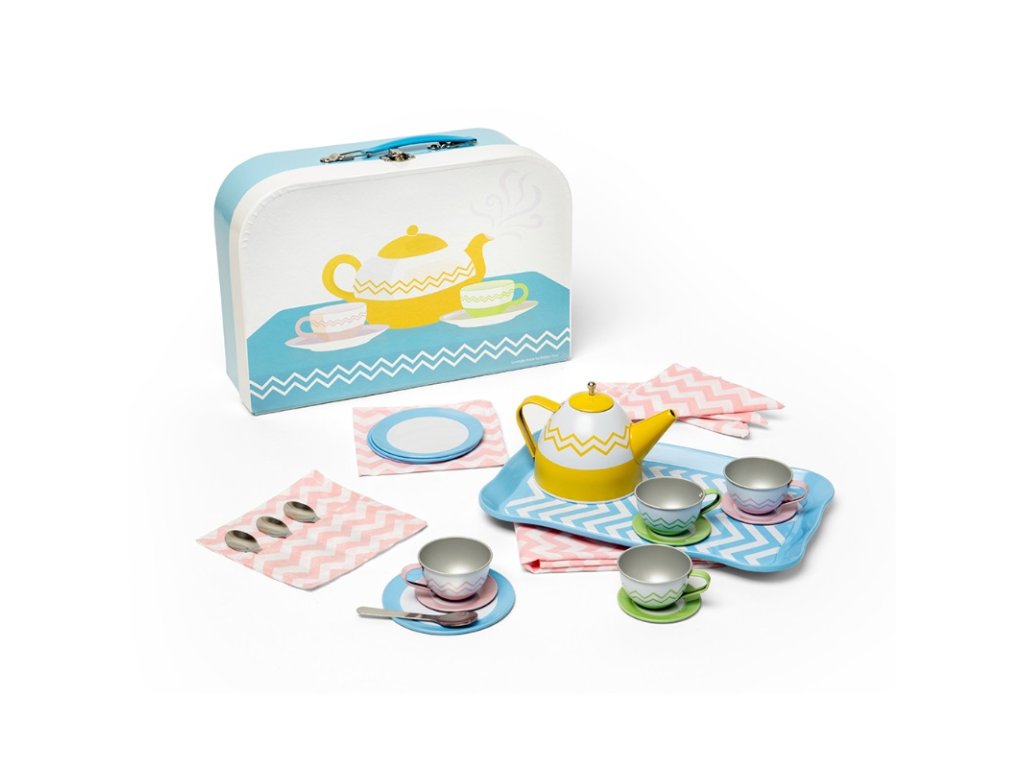 Čajová souprava v kufříku pro děti je vyrobená z kovu, což zajišťuje odolnost a dlouhotrvající zábavu. Sada podněcuje děti k simulaci různých scénářů a rolí během přípravy a podávání čaje, což rozvíjí jejich kreativitu. Děti se učí spolupracovat, sdílet a komunikovat s ostatními během společenských situací, což také přispívá k rozvoji sociálního povědomí a empatie. Souprava obsahuje kompletní vybavení pro přípravu a podávání čaje. Kufřík z pevného kartonu slouží nejen jako praktické úložiště pro veškeré vybavení, ale také umožňuje dětem snadno přenášet svou čajovou soupravu kamkoliv jdou. Hlavní vlastnosti: podporuje rozvoj dětských dovedností a fantazie rozvoj sociálních dovedností a kreativityDoplňkové parametry