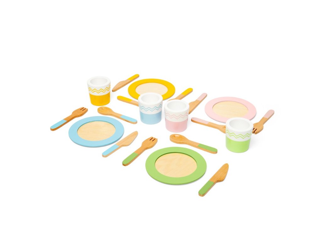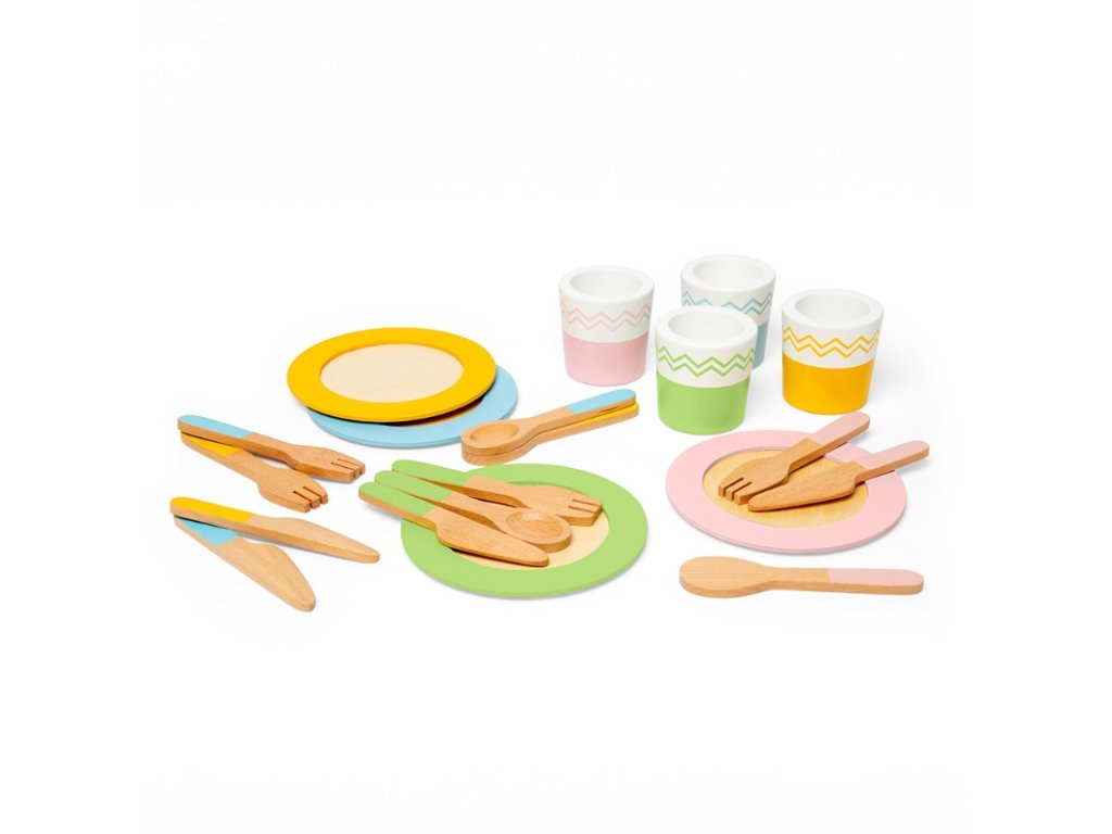 Servírovací sada pro děti přináší do dětského světa zážitek z domácího servírování a společných večeří. Tato sada je vyrobena z kvalitního dřeva a obsahuje kompletní soubor nádobí a příborů, které jsou navrženy v malých rozměrech pro malé ručičky. Obsahuje 4 talíře, 4 hrníčky, 12 příborů, které dětem umožňují simulovat různé scénky a situace během přípravy stolu a jídla. Každá položka je detailně zpracována, což přispívá k realističnosti a autentičnosti. Poskytne dětem hodiny zábavy, podporuje rozvoj sociálních dovedností, fantazie a kreativity. Děti se učí spolupracovat, sdílet a komunikovat s ostatními během společenských situací, což také přispívá k rozvoji jejich sociálního povědomí a empatie. Hlavní vlastnosti: podporuje rozvoj dětských dovedností a fantazie rozvoj sociálních dovedností a kreativityvyrobeno z vysoce kvalitních, zodpovědně získaných materiálůobsahuje 20 dílůDoplňkové parametry
