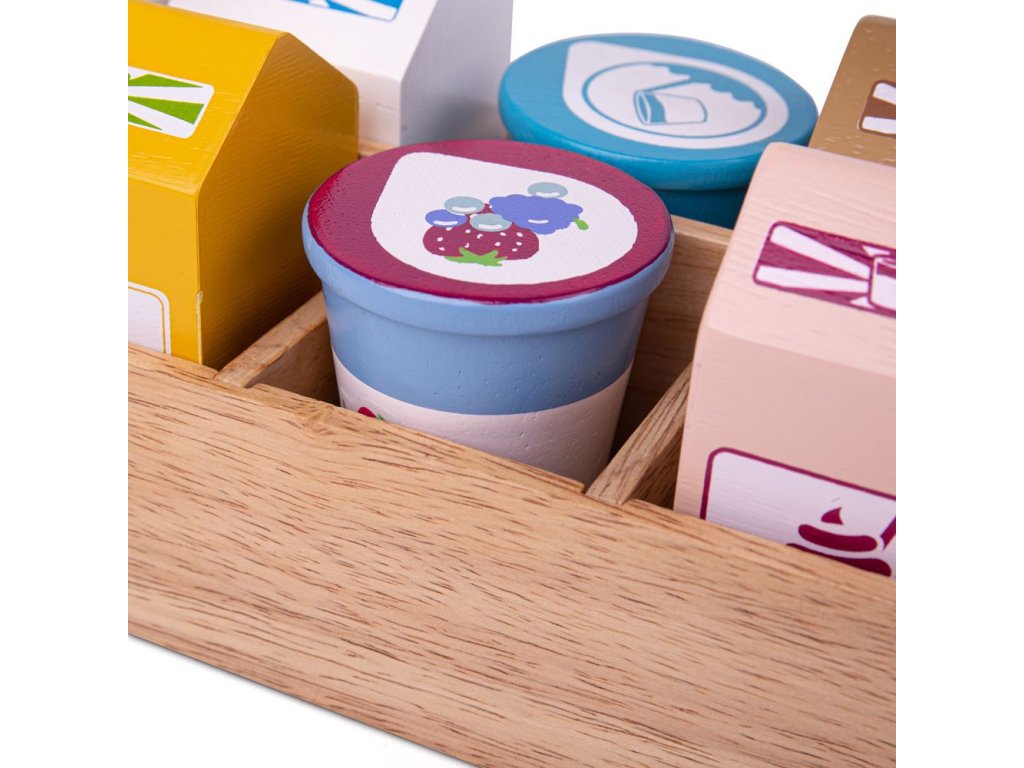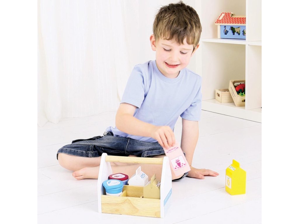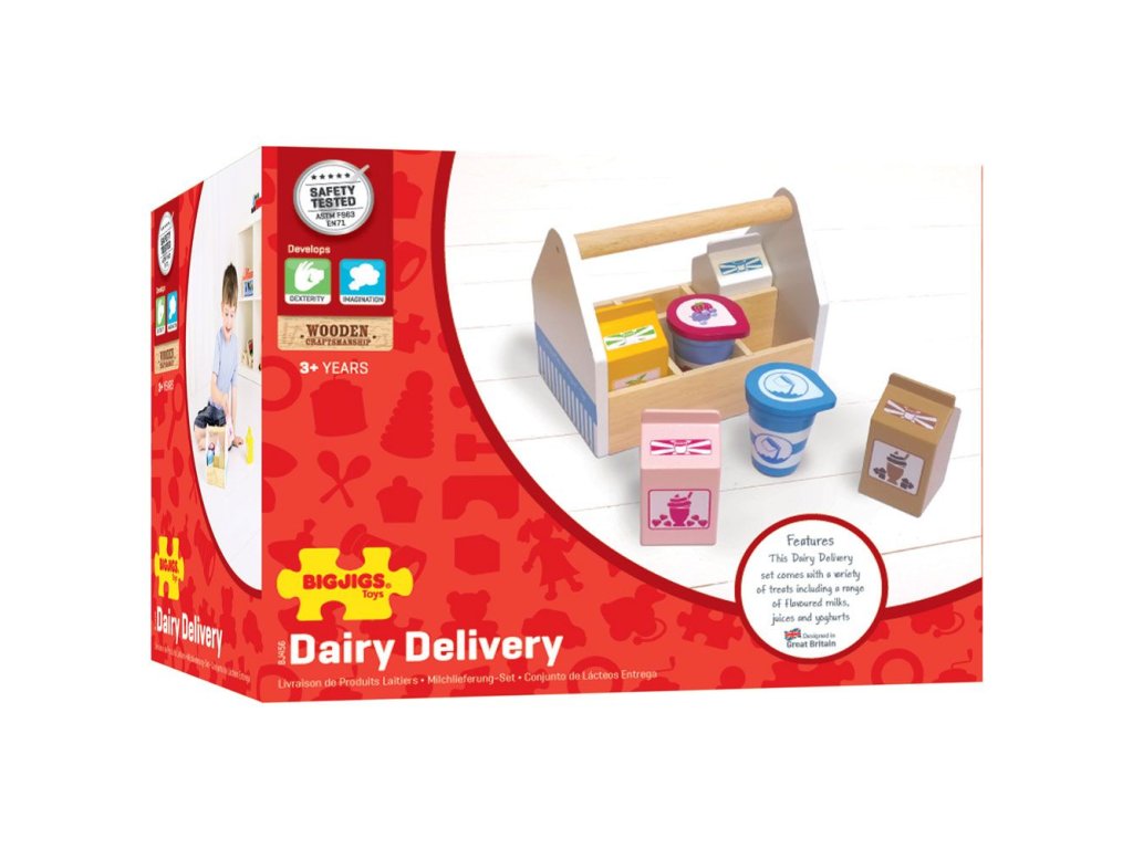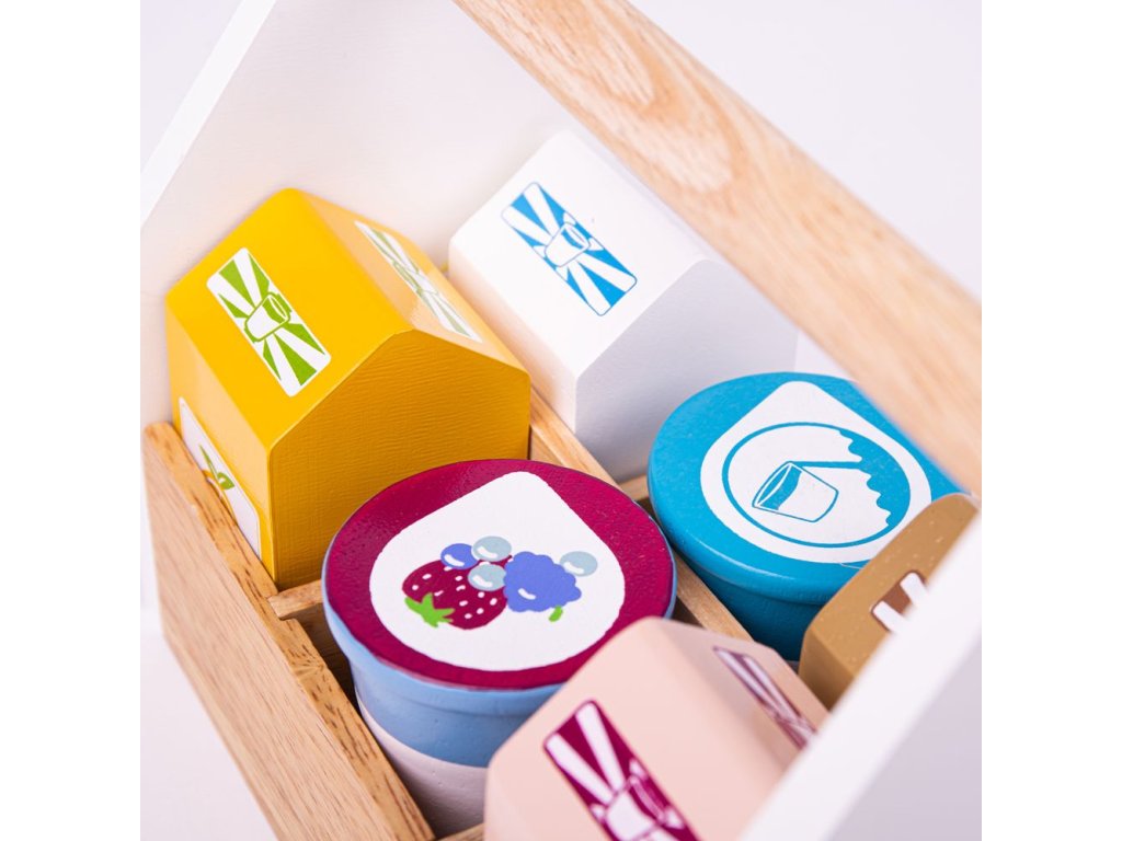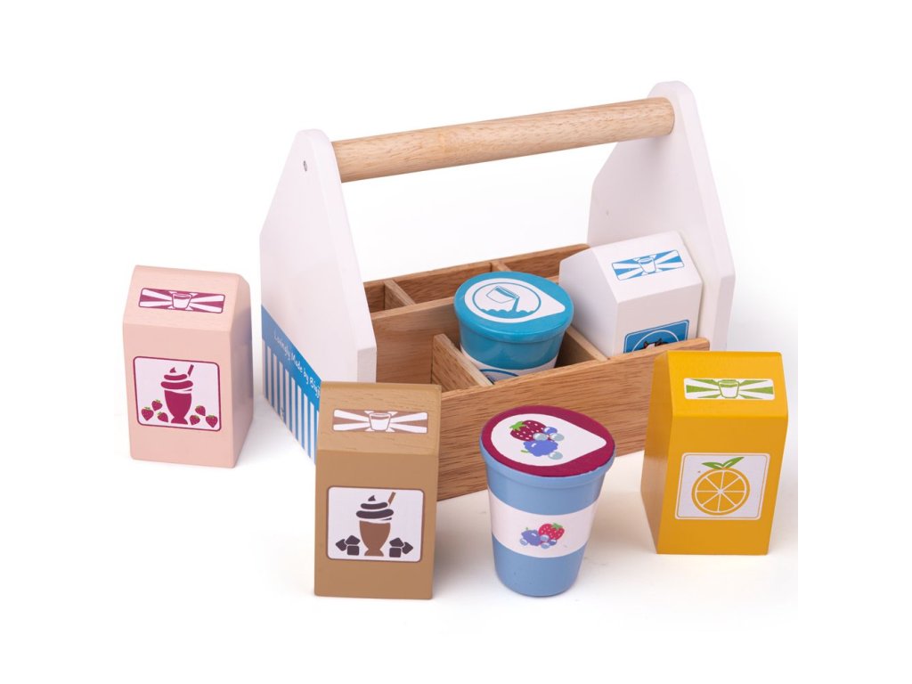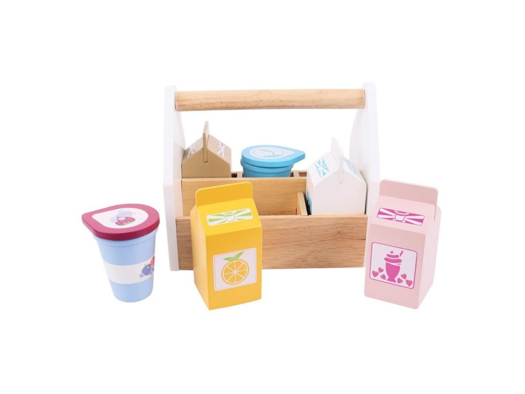 Uvnitř této robustní přepravky s rukojetí se nacházejí čtyři kartony (mléko, pomerančový džus, jahodový a čokoládový koktejl) plus kelímek jogurtu a smetany. BigJigs je velký fanoušek zdravé výživy a jaká by byla lepší cesta učit děti o zdravé výživě, než pomocí hraček z našeho sortimentu? Dřevěné hrací jídlo je ideální k tomu, aby se vaše dítě dozvědělo o důležitosti zdravé a vyvážené stravy. A také o tom, odkud naše jídlo pochází a jak ho připravujeme. Hlavní vlastnosti: podporuje kreativní a nápadité hranívyrobeno z vysoce kvalitních, zodpovědně získaných materiálůsplňuje aktuální evropské bezpečnostní normyDoplňkové parametry