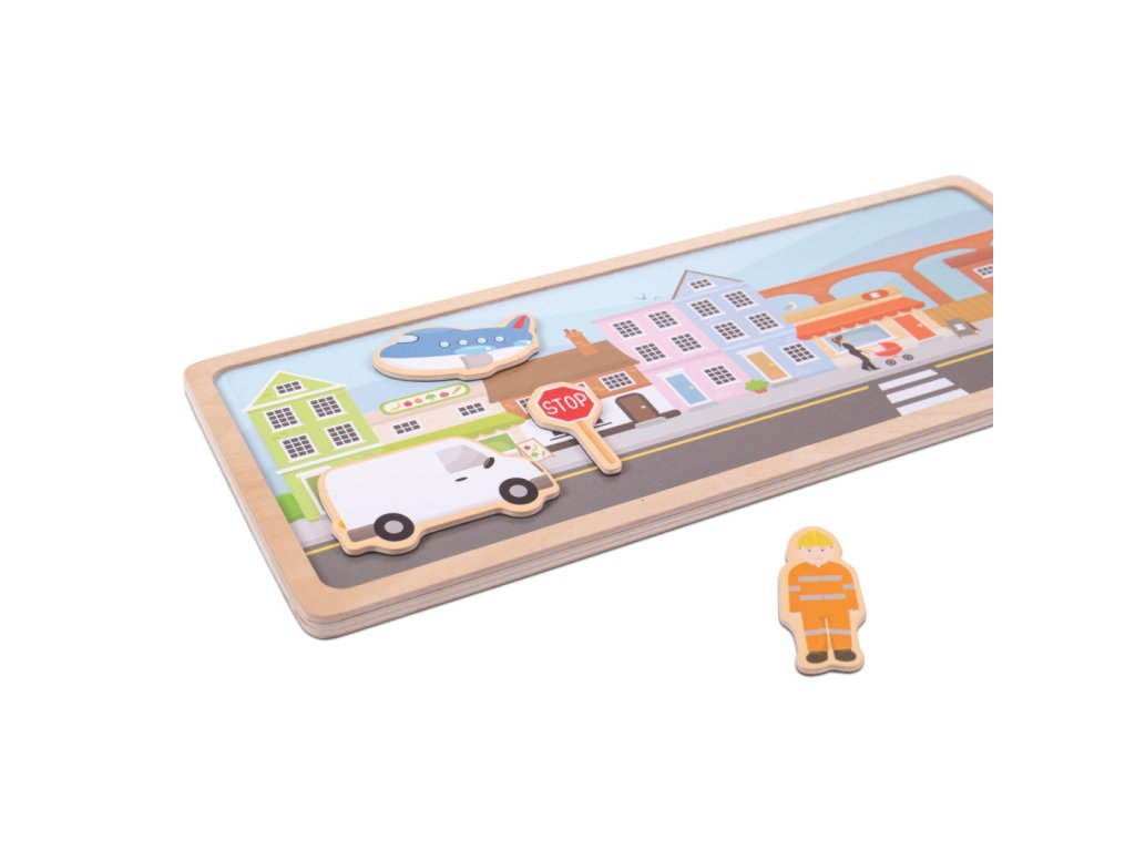 Od Vláčku po nákladní vůz, tato zábavná sada magnetického puzzle naučí děti nejen o různých druzích dopravy a o tom, co by mohly v rušném městě najít, ale povzbudí je k využití fantazie a vymýšlení vlastních příběhů. Díky řadě dílků mohou děti při každé hře vytvořit jinou scénu, která nabízí spoustu prostoru pro představivost. Obsahuje 14 robustních dřevěných magnetů, které lze použít na magnetickou tabuli a dokonce i na lednici! Skvělý způsob, jak podpořit kreativní myšlení, představivost a koordinaci a rozvíjet hrubou a jemnou motoriku. Vyrobeno z vysoce kvalitních materiálů, které pocházejí ze zodpovědných zdrojů. Vyhovuje současným evropským bezpečnostním normám. Hlavní vlastnosti: obsahuje 14 dílkůvelké dílky puzzle s magnetypodporuje kreativitu, koordinaci a motorikuDoplňkové parametry