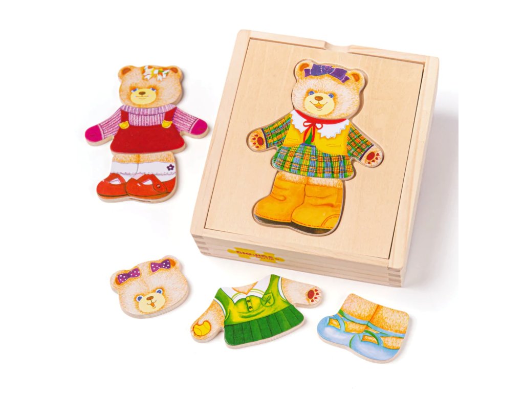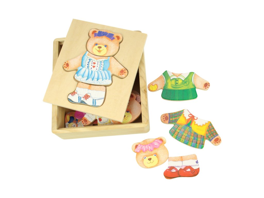 Dřevěné oblékací puzzle obsahuje celou řadu pestrobarevných dřevěných dílků, včetně oblečení a obličejů medvědice s různými výrazy. Jednotlivé díly se skládají na destičku, která zároveň slouží jako víko krabičky. Praktická krabička k uložení všech dílků puzzle. Rozvíjí schopnosti třídění a posiluje každodenní slovní zásobu. Pomáhá rozvíjet zručnost a koordinaci. Vyrobeno z vysoce kvalitních a zodpovědně zpracovaných materiálů. Vyhovuje současným evropským bezpečnostním normám. Hlavní vlastnosti: obsahuje 18 dílků puzzlepraktická krabička k uložení všech dílků puzzlerozvíjí slovní zásobu a motoriku dětíDoplňkové parametry
