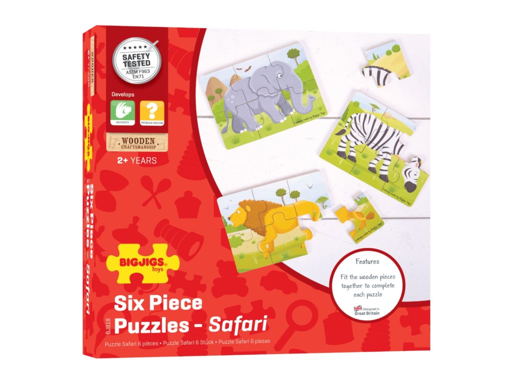 Děti budou skutečně rády skládat dřevěné puzzle a sledovat, jak se rýsuje barevné scény Safari. Obsahuje 3 puzzle. Toto krásně navržené puzzle je skvělý způsob, jak rozvíjet představivost a zlepšovat logické myšlení. Jakmile bude umístěn poslední díl, děti pocítí pocit úspěchu. Každý masivní dřevěný dílek puzzle má velikost ideální pro malé ručičky. Pomáhá rozvíjet zručnost, smyslové dovednosti a koncentraci. Hlavní vlastnosti: obsahuje 3 puzzlemasivní velké dřevěné kouskyrozvíjí koncentraci a jemnou motoriku.vyrobeno z vysoce kvalitních, zodpovědně získaných materiálůDoplňkové parametry