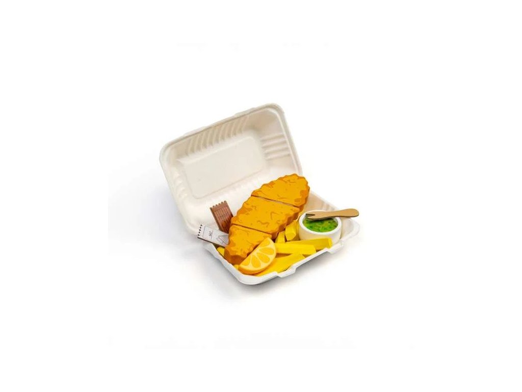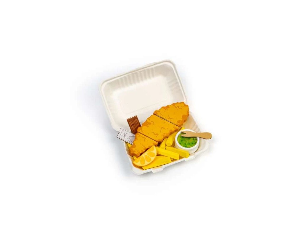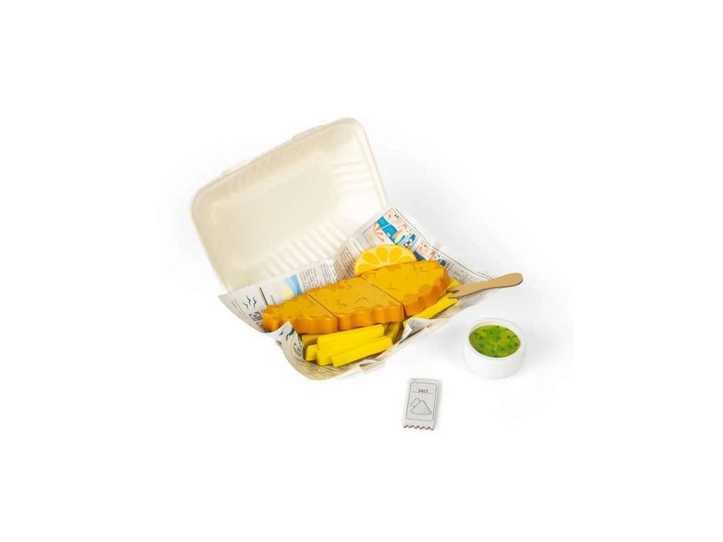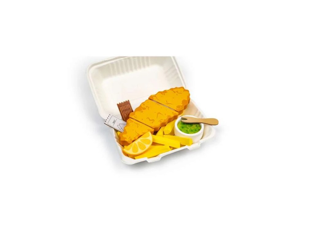 Dejte si křupavou rybu a hranolky podávanou na autentické podložce z novin! V interaktivních novinách Gull Gazette najdete náměty ke hře a různé aktivity, které hru obohatí. Sada obsahuje misku hrachové kaše, kousek citronu, sáček se solí a krabičku pro zabalení jídla s sebou. Ryba je rozdělena na tři části, takže ji děti mohou vidličkou „nakrájet“. Hraní na role s dřevěnými hračkami v podobě jídla povzbuzuje děti ke komunikaci a interakci s ostatními, když přijímají objednávky, obsluhují zákazníky nebo si vychutnávají jídlo s přáteli. Kromě sociálního rozvoje hra zlepšuje jazykové dovednosti, kreativitu a představivost.Sada je vyrobena z prvotřídního a udržitelného dřeva s certifikací FSC® a nabarvena netoxickými barvami a laky. Splňuje aktuální evropské bezpečnostní normy. Sada obsahuje: rybu (rozdělenou na 3 části), hranolky, misku s hráškem, kousek citrónu, sáček se solí, noviny s aktivitami, krabici. Hlavní vlastnosti: 26 dílůrozvíjí sociální inteligenci, jazykové schopnosti, kreativní myšlení a komunikační dovednostizlepšuje jemnou motoriku a koordinaci ruka-okopodporuje hraní na rolevyrobeno ze dřeva s certifikací FSC®vhodné od 18 měsíců věku Značka a certifikát FSC® (Forest Stewardship Council) zaručuje, že dřevo, ze kterého byl produkt vyroben, nebylo vytěženo nelegálně a pochází z lesů obhospodařovaných šetrným či přírodě blízkým způsobem, ve kterém jsou dodržovány přísné environmentální a sociální požadavky. Značka FSC® na výrobku znamená, že svým nákupem pomáháte chránit lesy a podporujete šetrné, odpovědné či přírodě blízké hospodaření, díky kterému jsou naše lesy stabilnější, zdravější, mají přirozenou druhovou skladbu a lépe odolávají negativním následkům klimatických změn.Doplňkové parametry