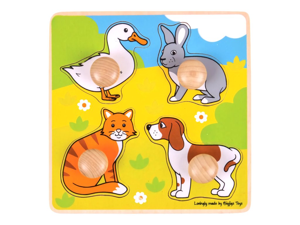 Tato dřevěná hádanka obsahuje čtyři rozeznatelná domácí zvířata včetně kachny, králíka, kočky a psa. Hráč se musí podívat na vodítko ve spodní části hádanky, aby zjistil, který dřevěný kus patří do které pozice. Snadné zvedání dřevěných dílků je opatřeno úchytem. Každá dřevěná skládačka je velkoryse rozměrná, aby usnadnila malým rukám zvednout, uchopit, prozkoumat a vložit. Skvělý způsob, jak rozvíjet slovní zásobu a pomáhat nejmenším, aby si vzpomínali na slova, když rozpoznávají tvary, barvy a obrazy. Pomáhá rozvíjet zručnost, odpovídající schopnosti a soustředění. Dřevěné puzzle Bigjigs Toys jsou vytištěny s obrázky nebo barvami, které napomáhají procesu učení a zvyšují vzdělávací hodnotu. Vyrobeno z vysoce kvalitních, zodpovědně dodávaných materiálů. Odpovídá současným evropským bezpečnostním normám. Obsahuje 4 dílky puzzle. Hlavní vlastnosti: obsahuje 4 dílkyvelké dílky puzzle s úchytypodporují rozvoj komunikace, zručnosti a soustěděníDoplňkové parametry