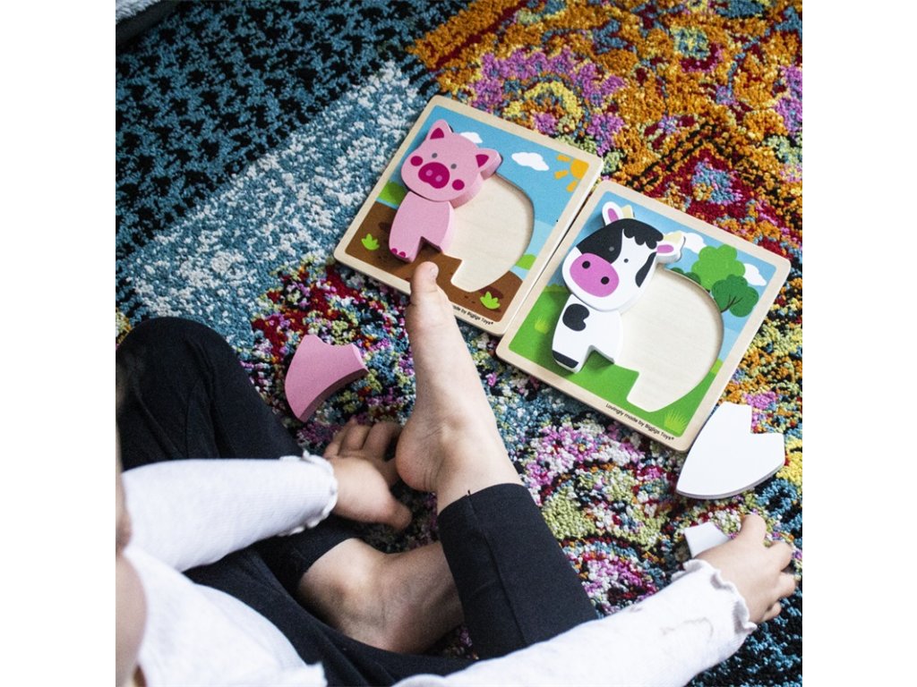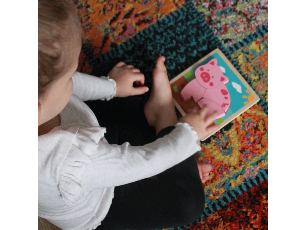 Ideální první dřevěné puzzle pro nejmenší. Robustní vkládací puzzle s velkými dílky, které vytvoří prasátko. Skvělý způsob procvičení jemné motoriky, logického myšlení a poznávání tvarů a barev. Toto dřevěné puzzle pro batolata je dodáváno s hladkou dřevěnou základní deskou s malovanou scénou. Batolata mohou také procvičovat počítání dílků skládačky od 1 do 4. Pomáhá také rozvíjet jemné motorické dovednosti a zručnost.Vyrobeno z vysoce kvalitních, zodpovědně získaných materiálů. Malováno netoxickými barvami a laky. Splňuje aktuální evropské bezpečnostní normy. Vhodné od 12 měsíců. Hlavní vlastnosti: 4dílné dřevěné puzzleIdeální velikost puzzle pro batolataRozvíjí jemnou motoriku a zručnostVyrobeno z vysoce kvalitních, zodpovědně získaných materiálůDoplňkové parametry