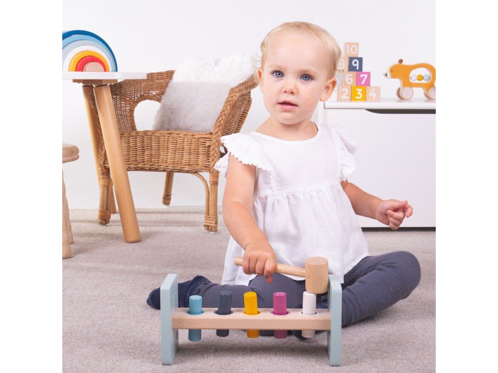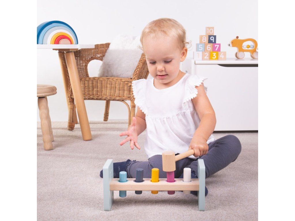 Děti se mohou při zatloukání barevných kolíků naučit rozpoznávat barvy. Po zatlučení všech stačí hračku otočit a mohou začít znovu! Ideální hra pro rozvoj koordinace ruka-oko a dovednost řešení problémů.Tato zatloukačka má zaoblené hrany pro bezpečnost dětí, také dobře uchopitelné kladivo. S dřevěnou hračkou děti získají sebejistotu.Hračka je vyrobena ze 100% FSC dřeva, které bylo získáno tím nejetičtějším způsobem. Odpovídá evropským bezpečnostním standardům, malováno netoxickými barvami, které jsou bezpečné pro děti. Hlavní vlastnosti: skládá se ze 7 dílků100% FSC dřevorozvíjí koordinaci ruka-oko Značka a certifikát FSC® (Forest Stewardship Council) zaručuje, že dřevo, ze kterého byl produkt vyroben, nebylo vytěženo nelegálně a pochází z lesů obhospodařovaných šetrným či přírodě blízkým způsobem, ve kterém jsou dodržovány přísné environmentální a sociální požadavky. Značka FSC® na výrobku znamená, že svým nákupem pomáháte chránit lesy a podporujete šetrné, odpovědné či přírodě blízké hospodaření, díky kterému jsou naše lesy stabilnější, zdravější, mají přirozenou druhovou skladbu a lépe odolávají negativním následkům klimatických změn.Doplňkové parametry