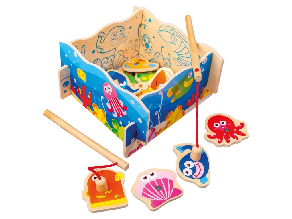 Zábavné rybaření v atraktivních barvách, s mnoha roztomilými obyvateli moří. V krásně dekorované čtyřstěnné kulise se pokuste ulovit magnetickou udičkou oblíbeného živočicha. Hru lze hrát jednotlivě i ve dvojici. Hračka je vyrobena z lehké, ale pevné překližky a masivního dřeva. Hlavní vlastnosti:4 díly kulis, 2 udičky a 11 herních dílkůodolné dřevěné provedeníDoplňkové parametry