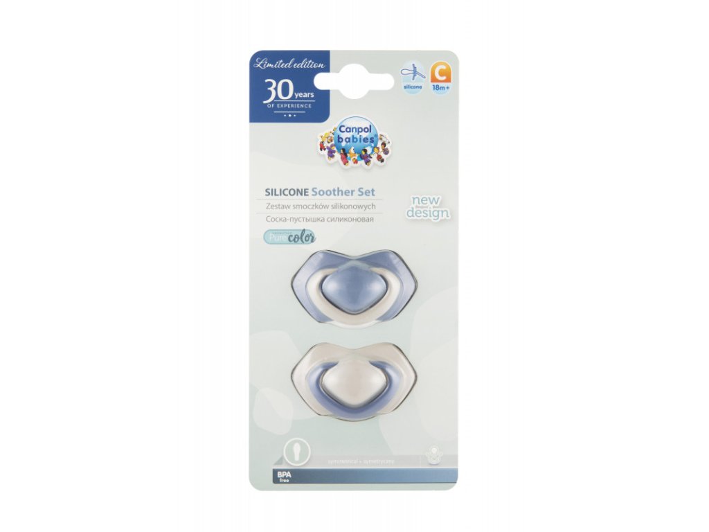 Canpol Babies Sada 2 ks symetrických silikonových dudlíků, 18m+, PURE COLOR modrý