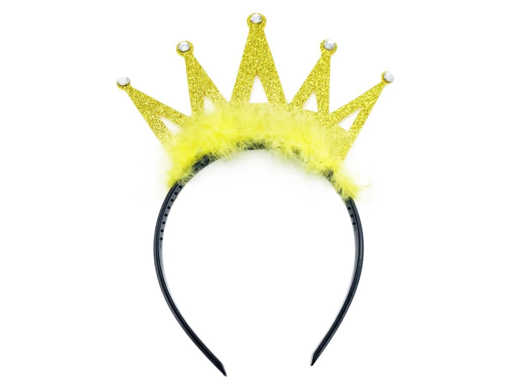 Dětská čelenka se zlatou korunkou, zdobená kamínky a peřím. Perfektní doplněk ke karnevalovému kostýmu. Upozornění ! V případě, že u zboží svítí skladem v externím skladu - je dodání zboží mezi 3 - 7prac. dny. Děkujeme za pochopení.Doplňkové parametry