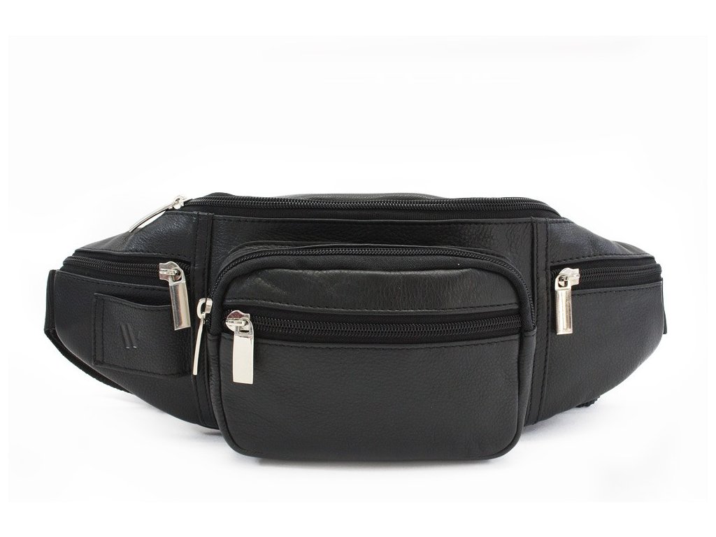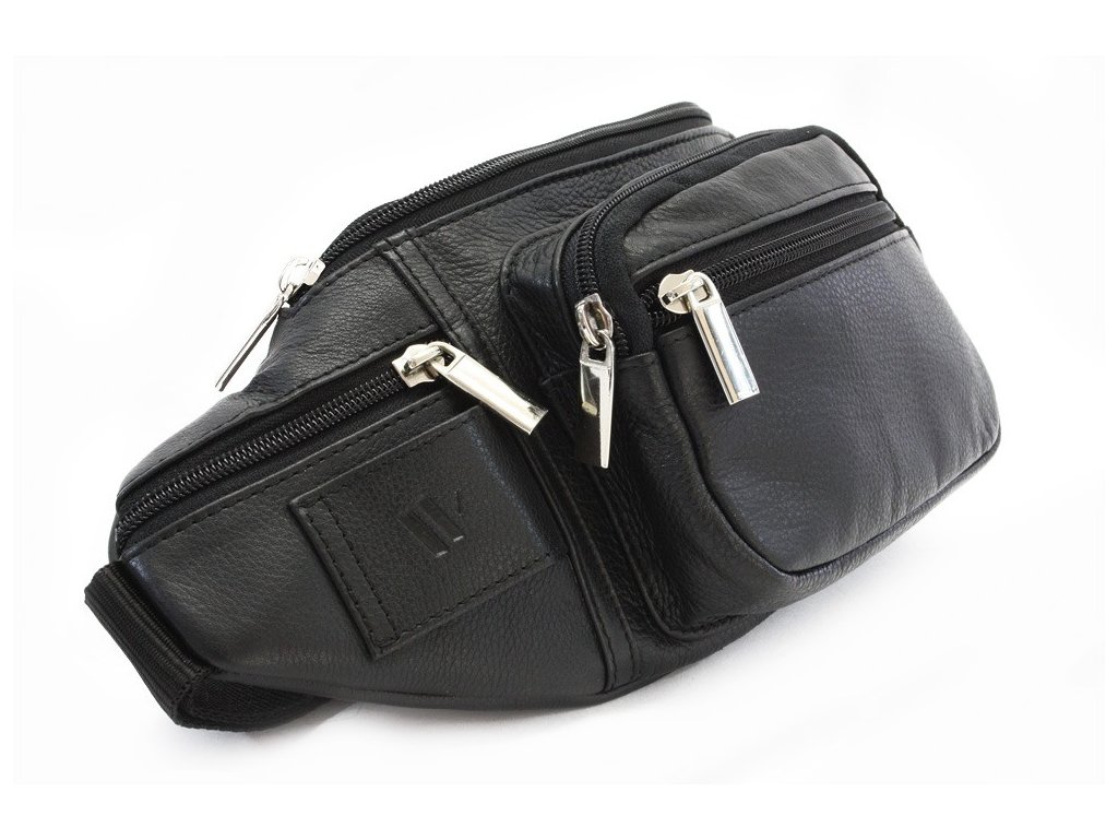Moderní volnočasová taštička kolem pasu - ledvinka má 5 zipových kapes různých velikostí, do kterých se vejde peněženka a jiné nezbytnosti. Na zadní straně je skrytá zipová kapsa. Zipy jsou v černé barvě se stříbrným kováním. Šití je černé. Popruh v černé barvě je nastavitelný do cca 90 cm, celková délka i s ledvinkou je cca 140 cm.