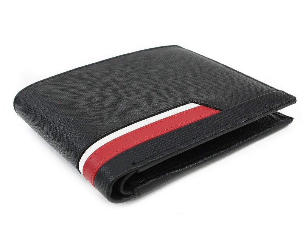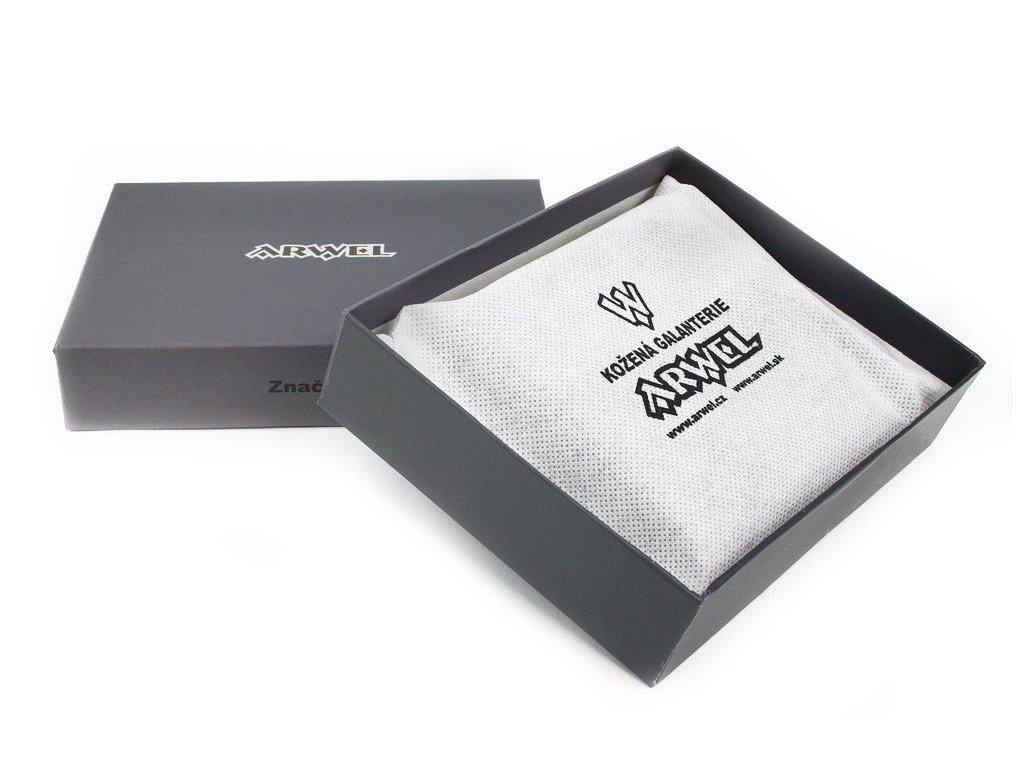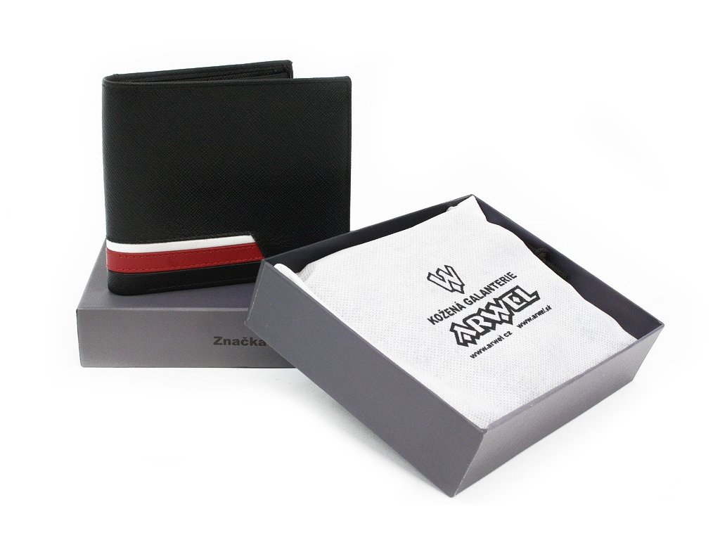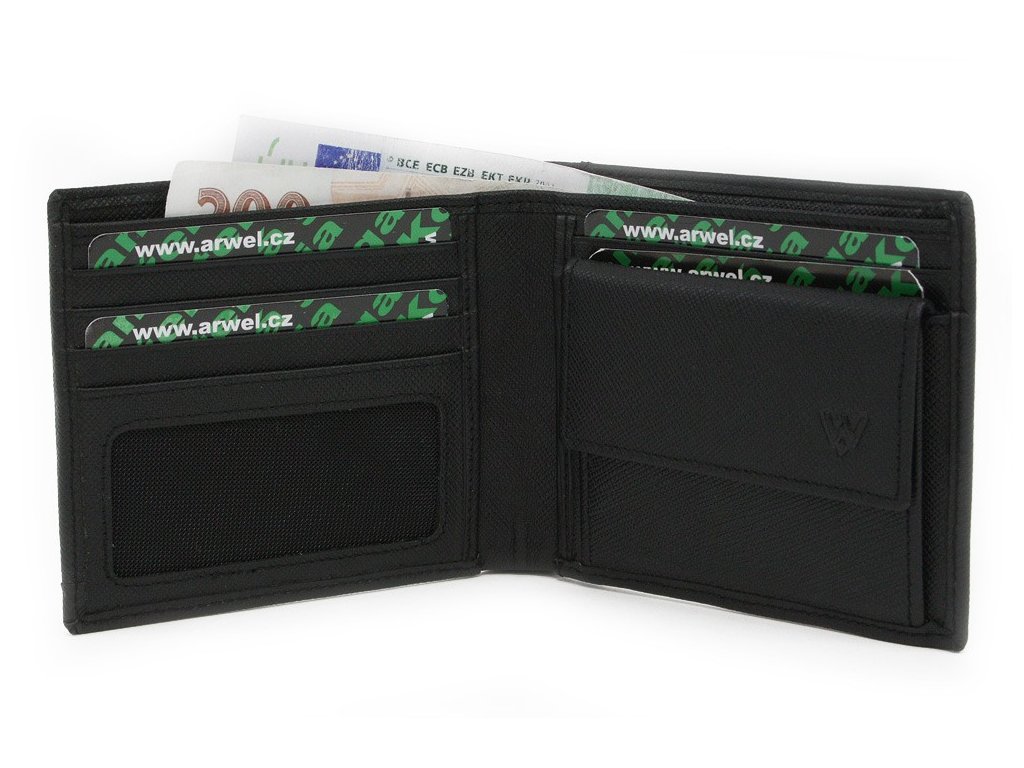 2 přihrádky na bankovky, klopnová kapsa na mince, 7 kapes na platební karty či doklady, 1 průhledné okno, 1 zadní kapsa.