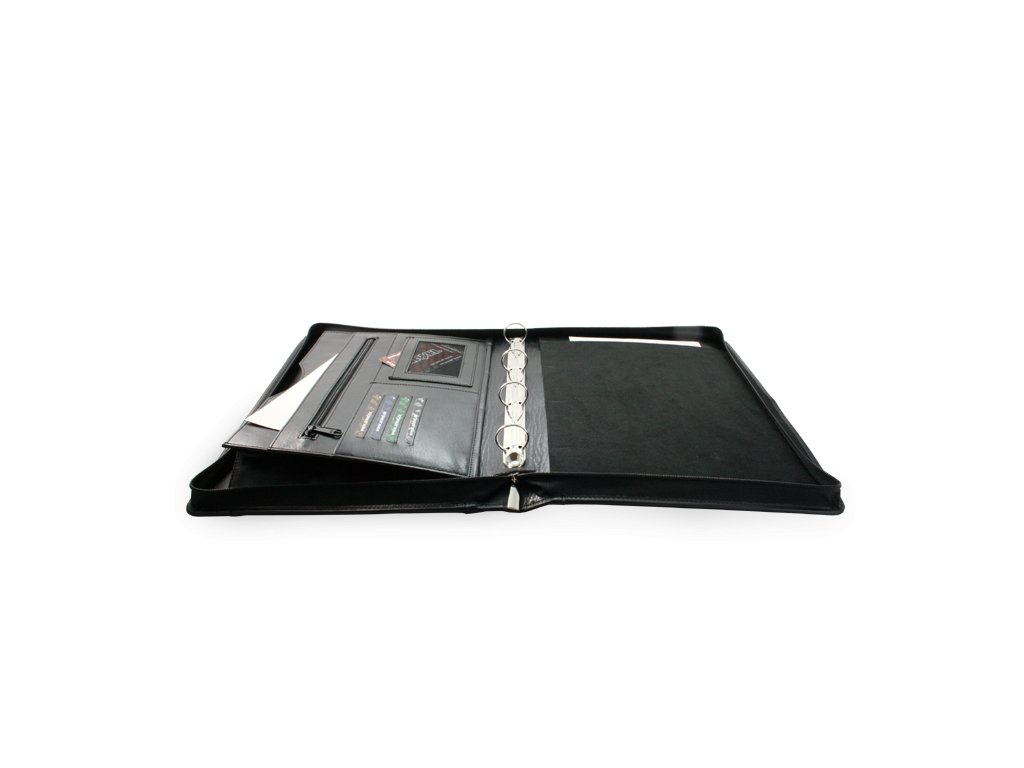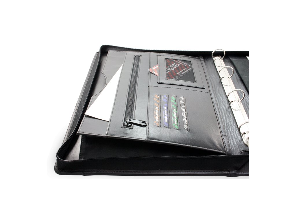 Spisové zipové desky pro vsunutí poznámkového bloku A4 + kroužková vazba, 4 přihrádky a malá kapsa na kreditní karty, vnitřní zipová a velká otevřená kapsa, 2 menší a 1 větší kapsa, vnější zipová kapsa, zip okolo. Vnitřní semišový podklad na pravé psací straně. Držadlo pro snadnější úchop.