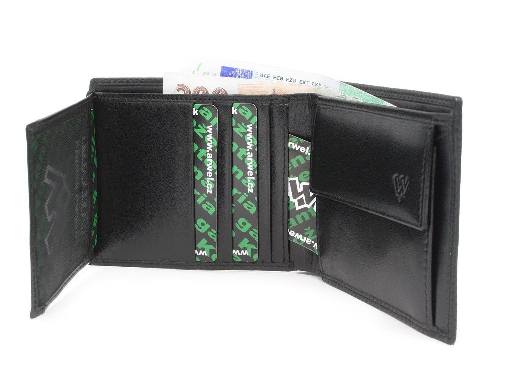 2 přihrádky na bankovky, klopnová kapsa na mince, 11 kapes na kreditní karty, občanský nebo řidičský průkaz, 2 skryté kapsy, 1 průhledné okno.