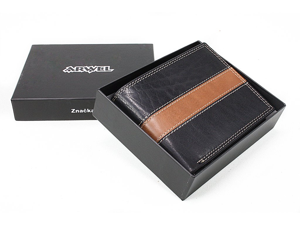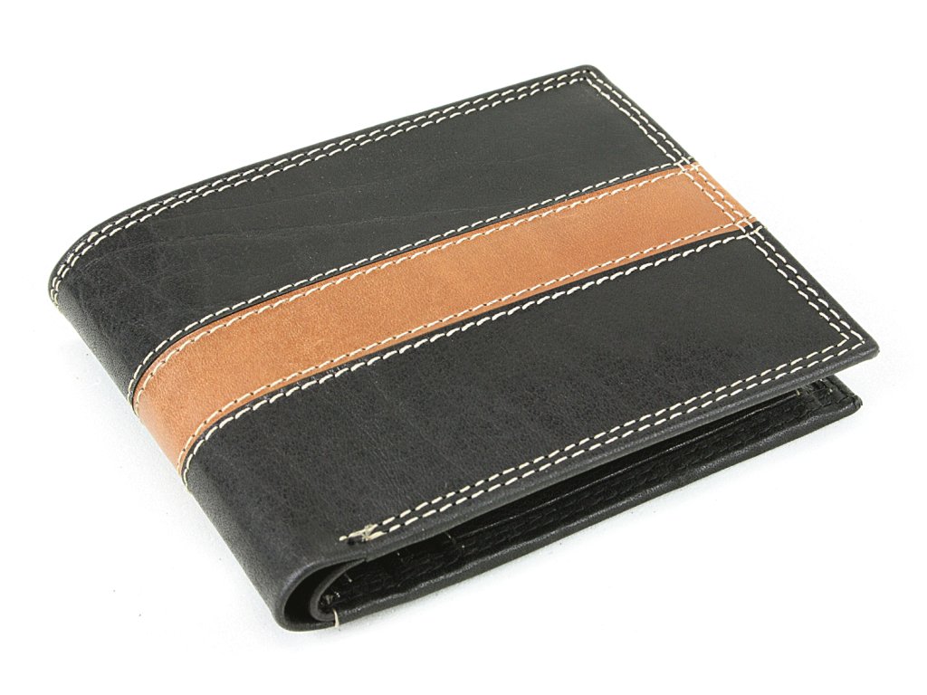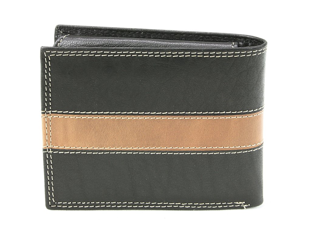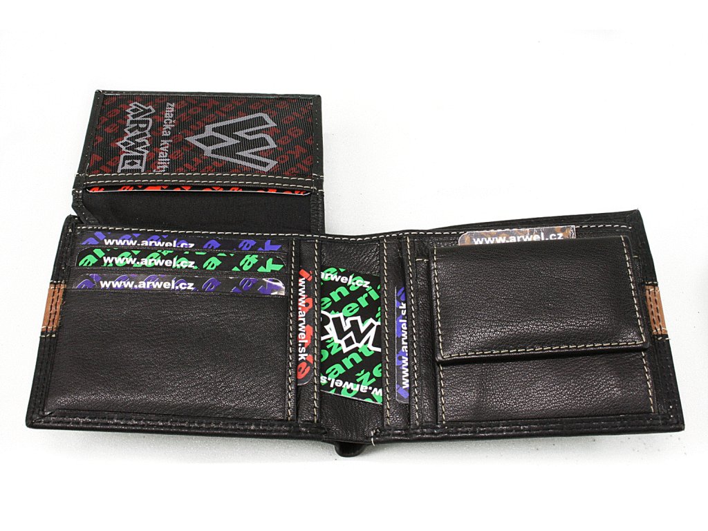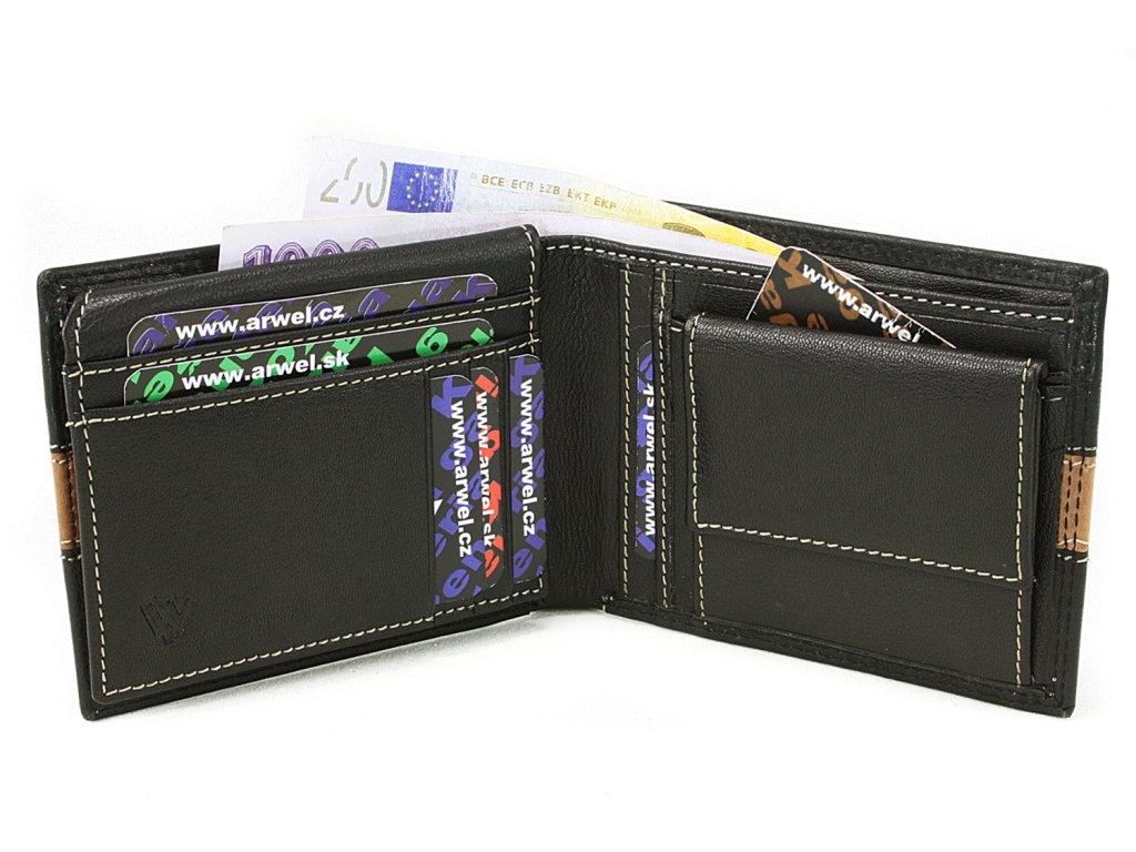2 přihrádky na bankovky a 1 kapsa na mince, 12 kapes na kreditní karty, 1 průhledná kapsa velikosti osobních dokladů. Světlé šití.
