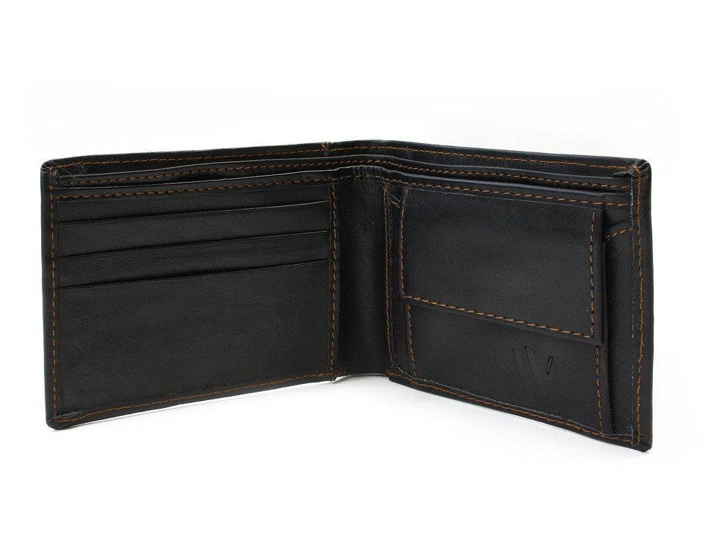 2 přihrádky na bankovky, klopnová kapsa na mince, 3 kapsy na kreditní a platební karty a 2 vnitřní kapsy velikosti osobních dokladů.