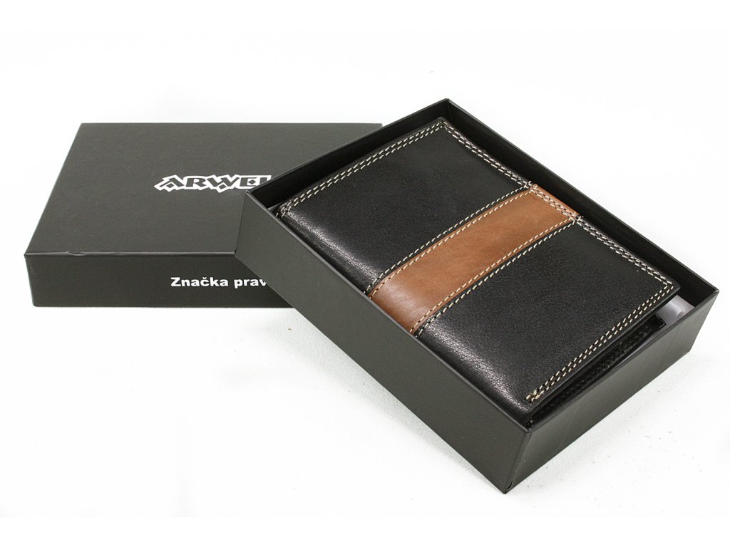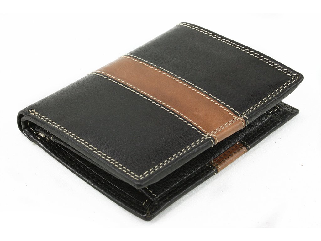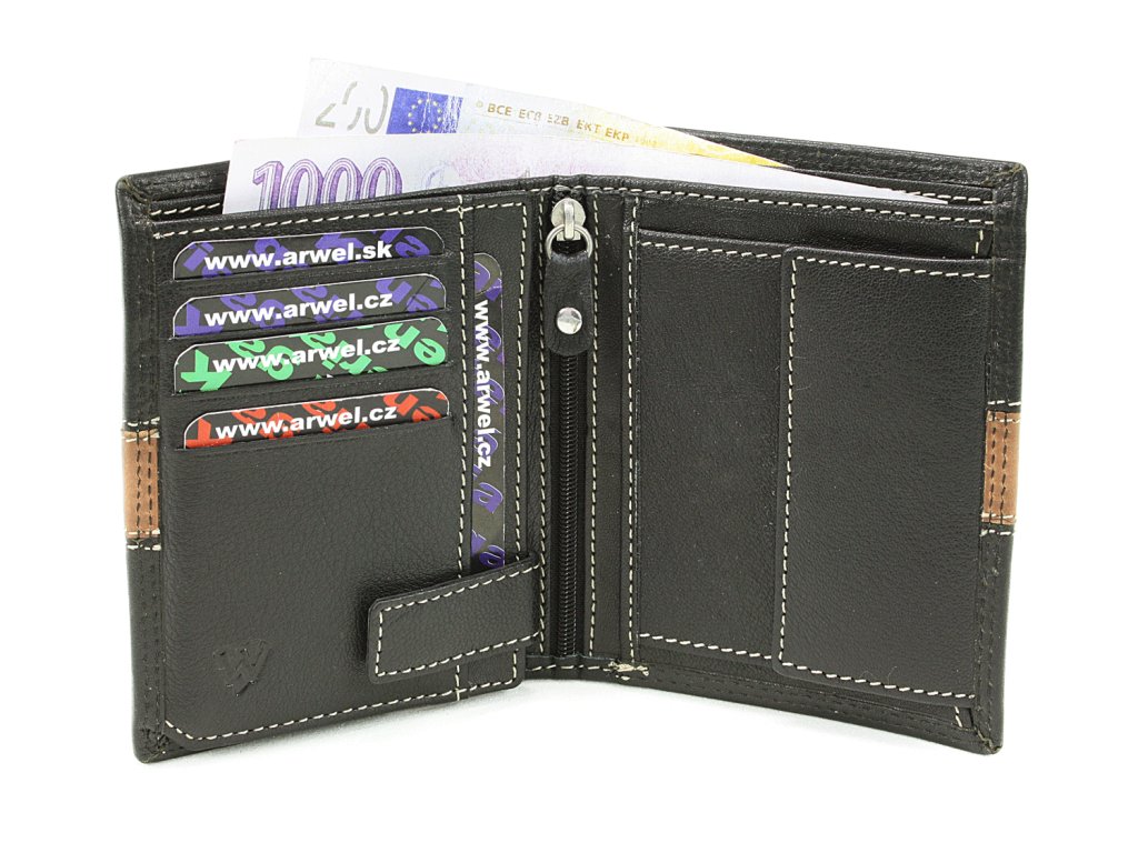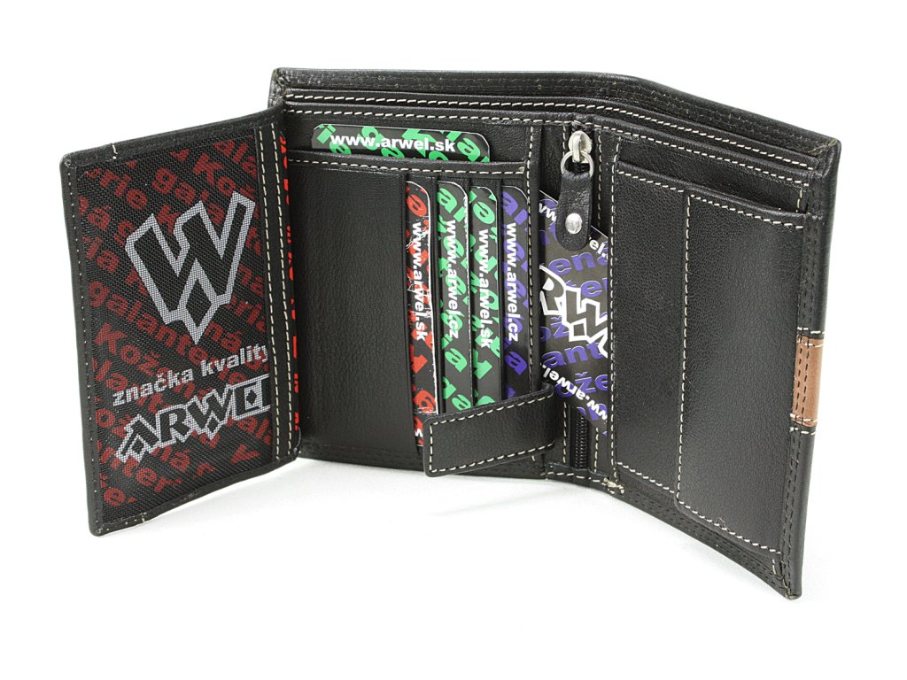 2 přihrádky na bankovky a 1 kapsa na mince, 12 kapes na kreditní karty, 1 vnitřní kapsa na zip, 1 průhledná kapsa velikosti osobních dokladů. Světlé šití.