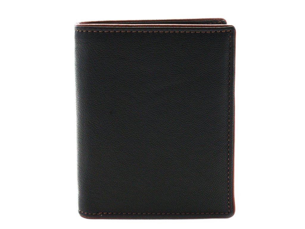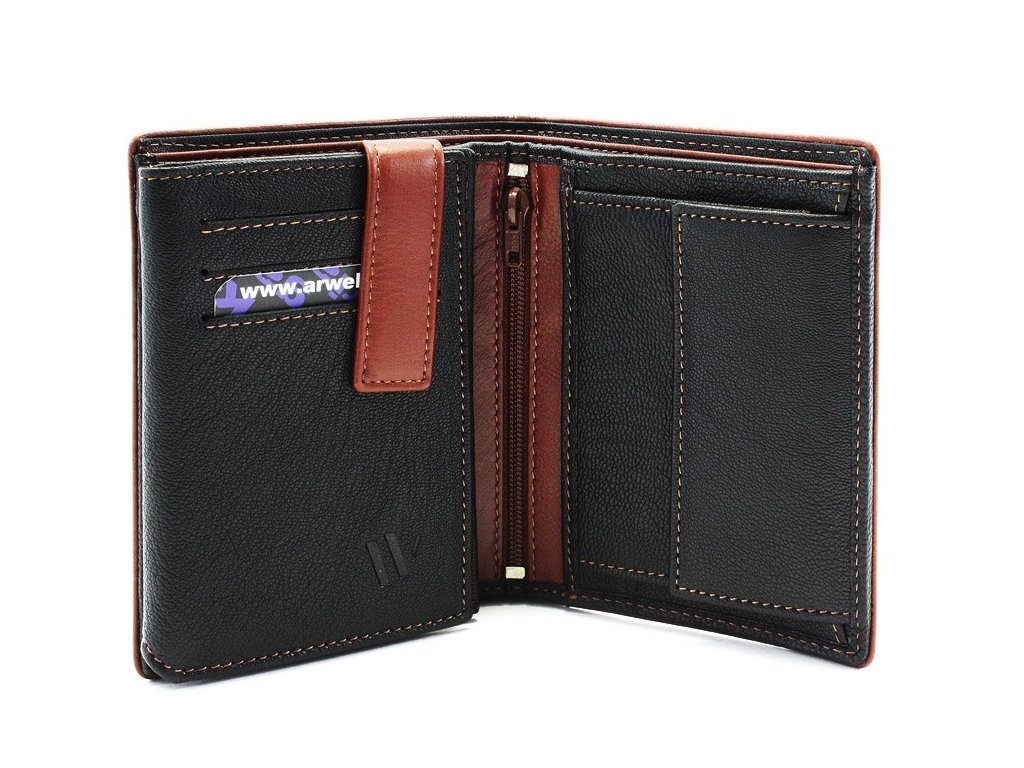 2 přihrádky na bankovky, klopnová kapsa na mince, 9 kapes na kreditní karty, občanský průkaz nebo řidičský průkaz, vnitřní zipová kapsička, 2 velké průhledné kapsy, 2 skryté kapsy. Hnědé šití.