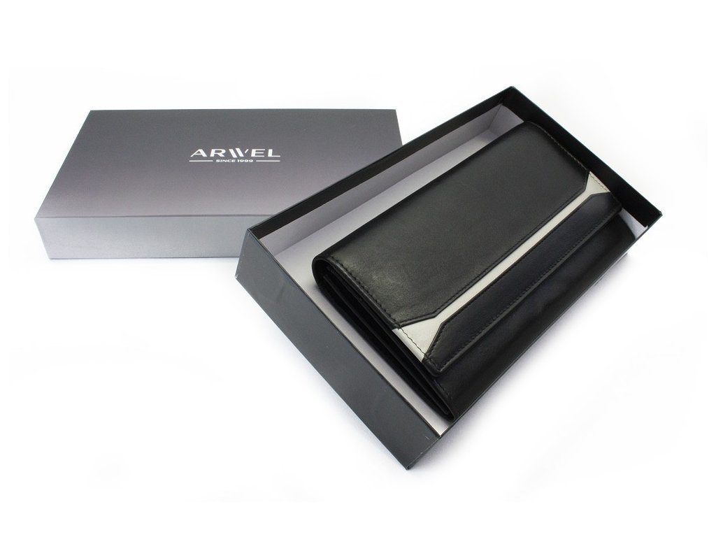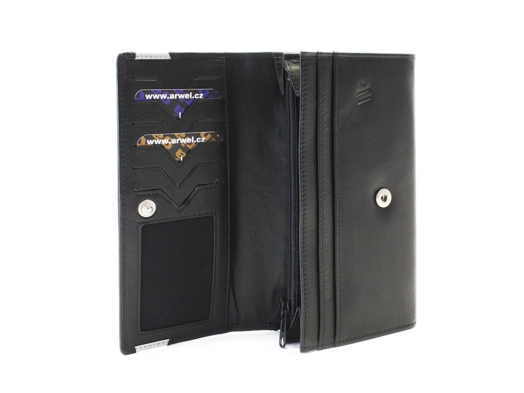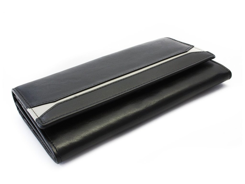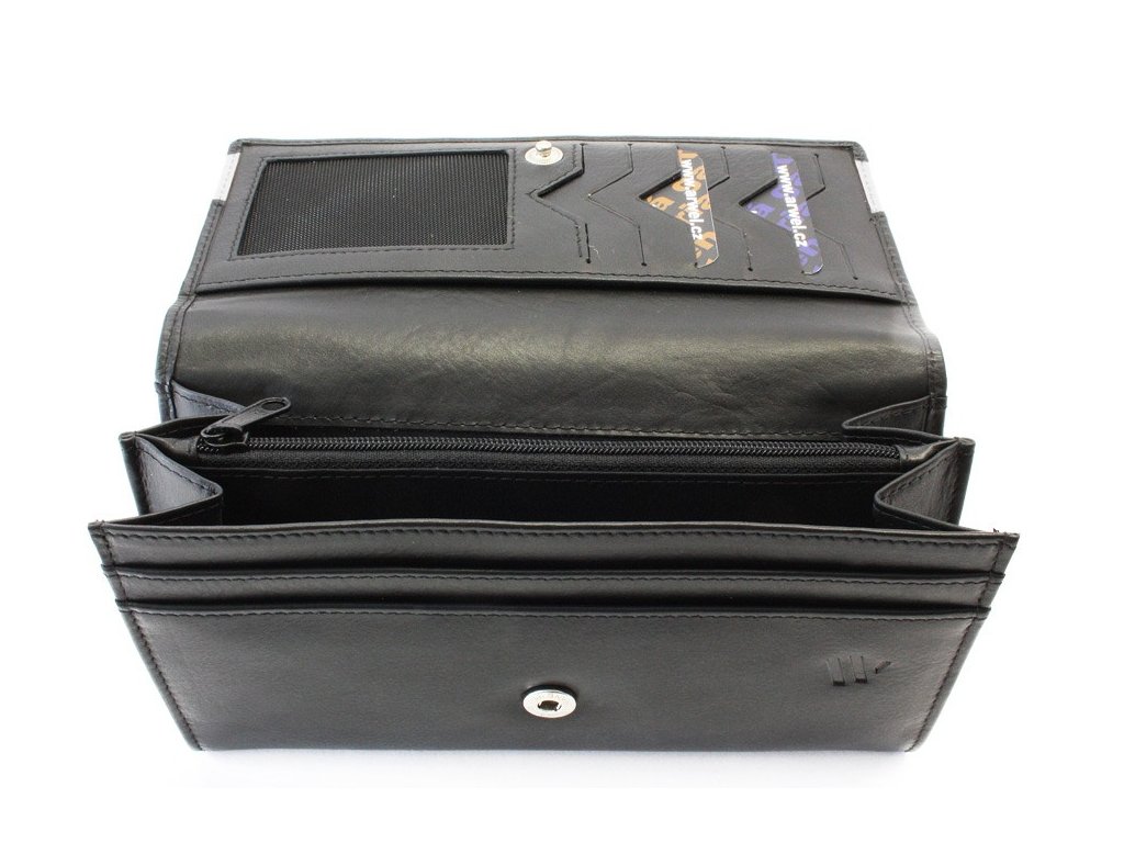 Kožená dámská klopnová peněženka obsahuje 2 přihrádky na bankovky, zipovou kapsu na mince, 5 kapes na kreditní karty, 1 průhlednou kapsu a 2 otevřené kapsy. Na zadní vnější straně se nachází 1 otevřená a 1 zipová kapsa. Základní rozměr: 18 x 10 x 2 cm Materiál: pravá hovězí kůže (NAPPA) Barva kůže: černá, šedá